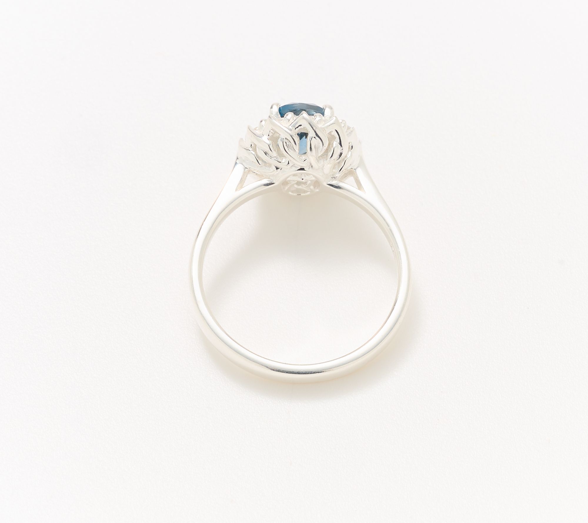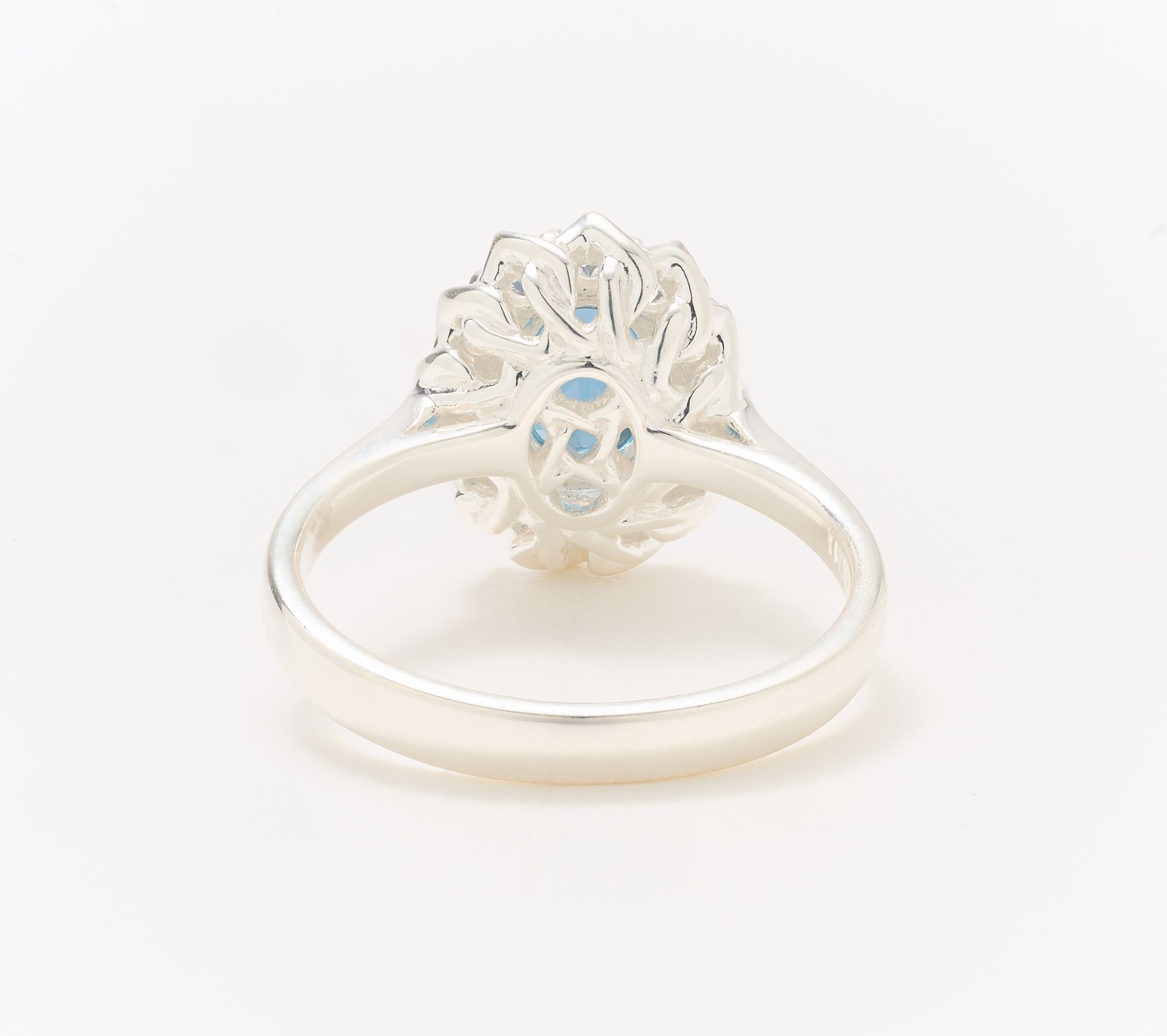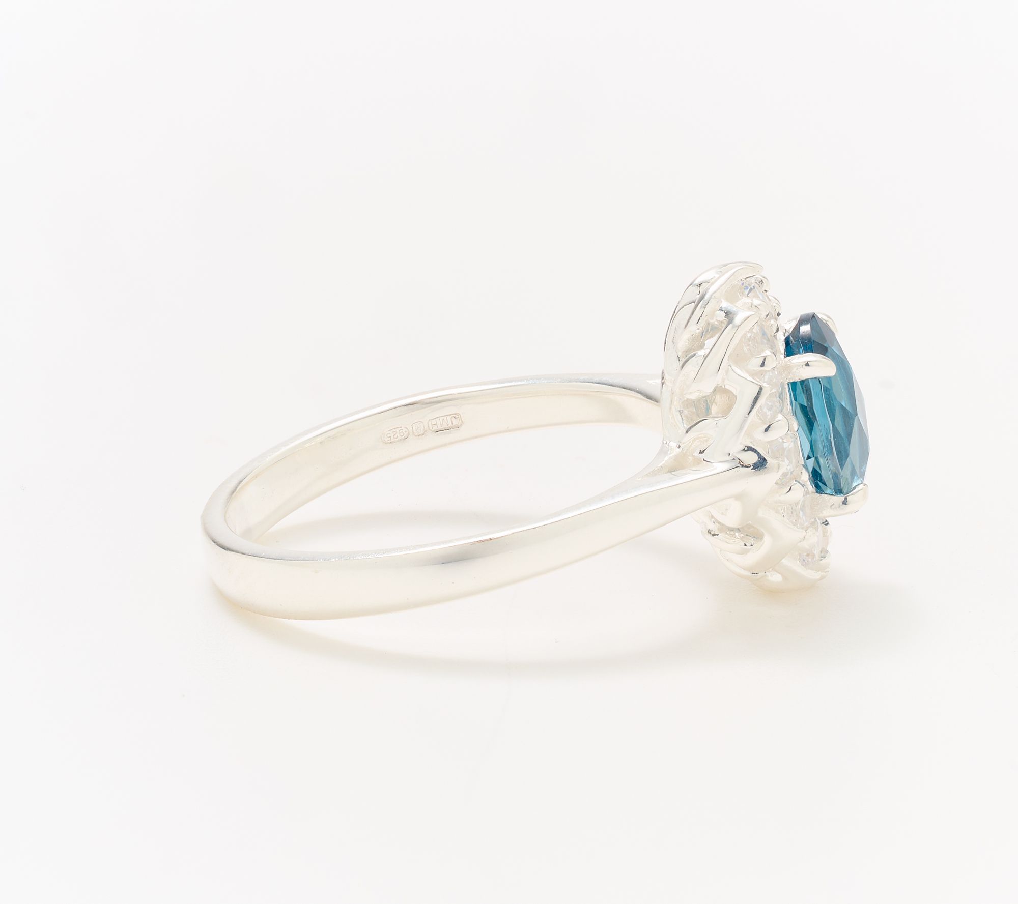 Bring a hint of Celtic heritage to your day with this sterling silver ring, where a basketweave design and signature knotwork express timeless charm. At the center, a vivid oval London blue topaz is cradled by a halo of simulated diamonds, creating a cluster design that sparkles with every movement. From JMH Jewellery.