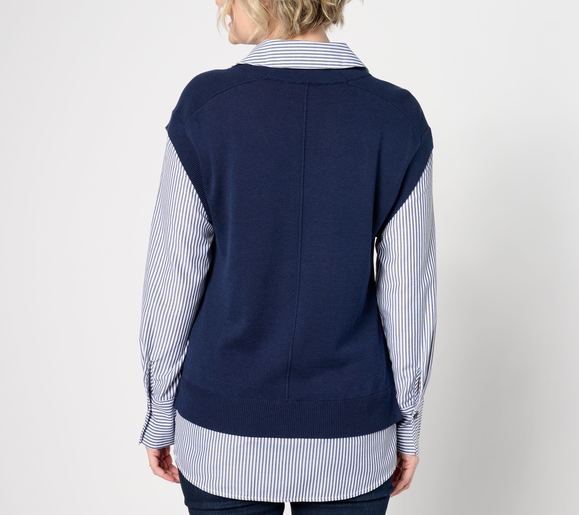 Fabrication: mixed media; sweater-knit vest; attached woven shirt collar, long sleeves, and bottom