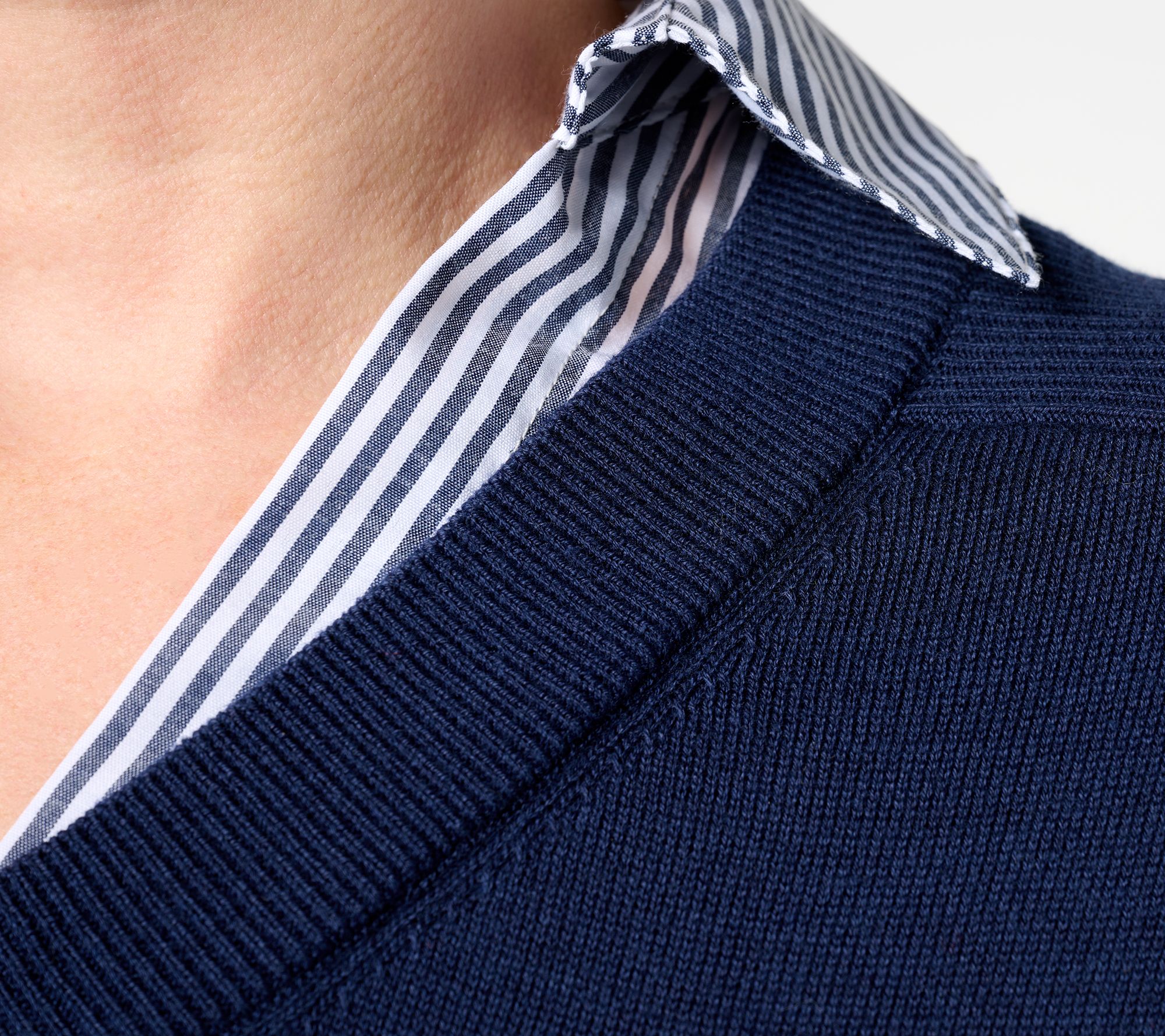 Features: V-neckline, ribbed vest trim, button cuffs, side slits