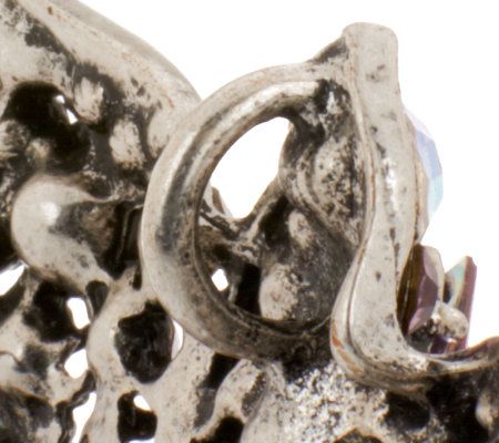 Elaborate floral and leaf design; center faceted, oval fuchsia resin crystal; round and marquise crystals; colors include shades of pink, yellow, amber, clear, purple, fuchsia, and peach; oxidized finish