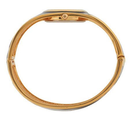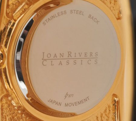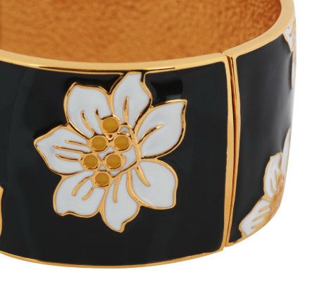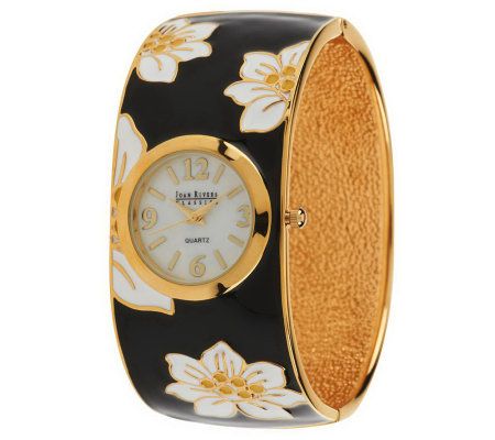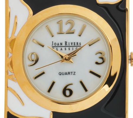 So much more than a watch. This timepiece is a true style statement--the goldtone bangle is colored with epoxy enamel and decorated with a vivid floral design. At the top is a white mother-of-pearl watch dial surrounded by a goldtone bezel as a classy finishing touch. From the Joan Rivers Classics Collection(TM).