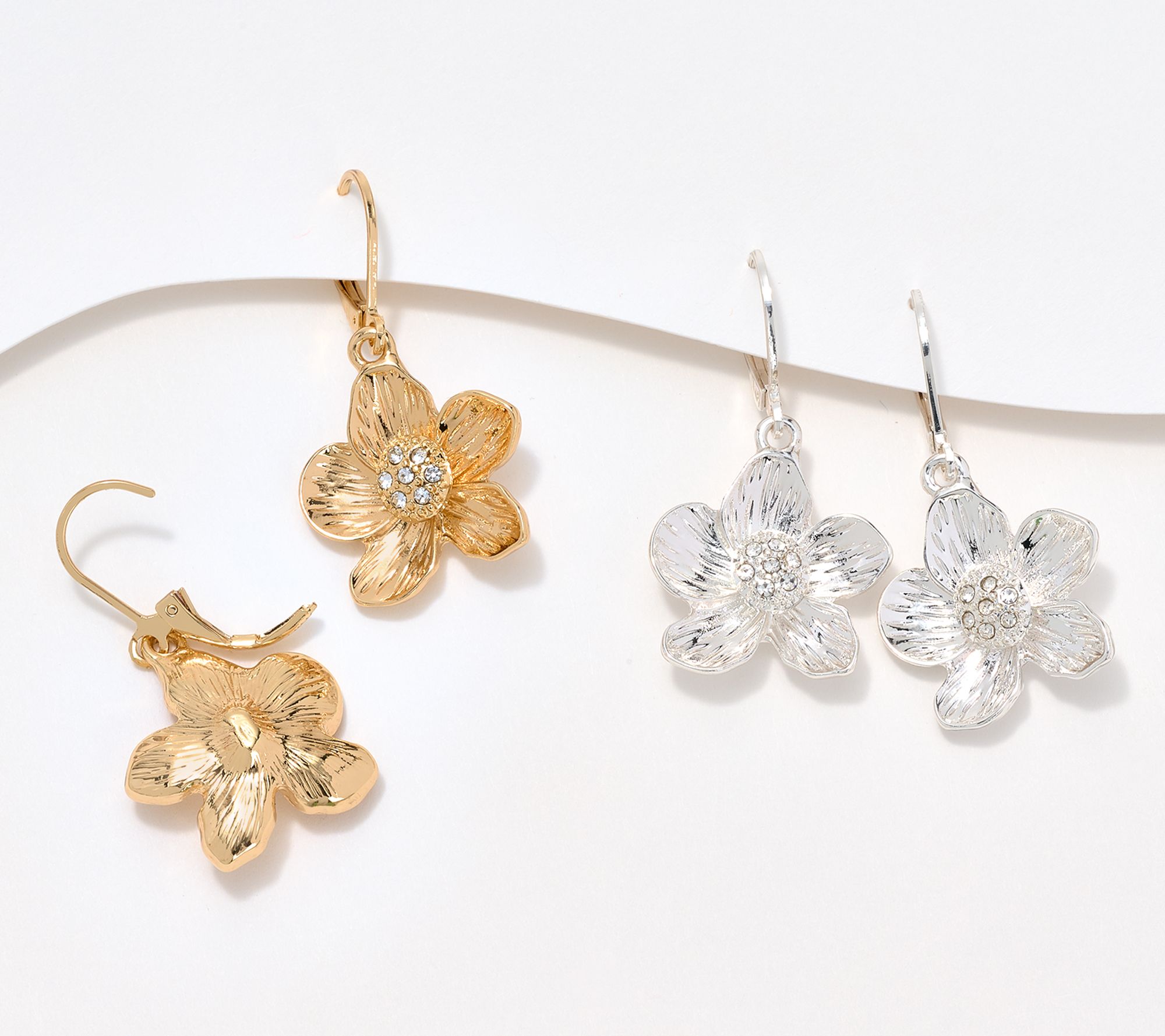 Made to match anything in your wardrobe, this duo of earrings amps up your accessory game with a lively etched flower design. Pave crystals sit inside the petals, adding a playful pop of shimmer. With one pair in goldtone and the other in silvertone, you're all set for a sweet-yet-sophisticated look no matter what outfit you choose to wear. From Joan Rivers Classics Collection®.