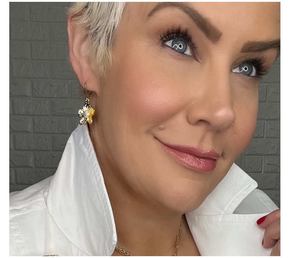 Etched flower design centered by pave crystals