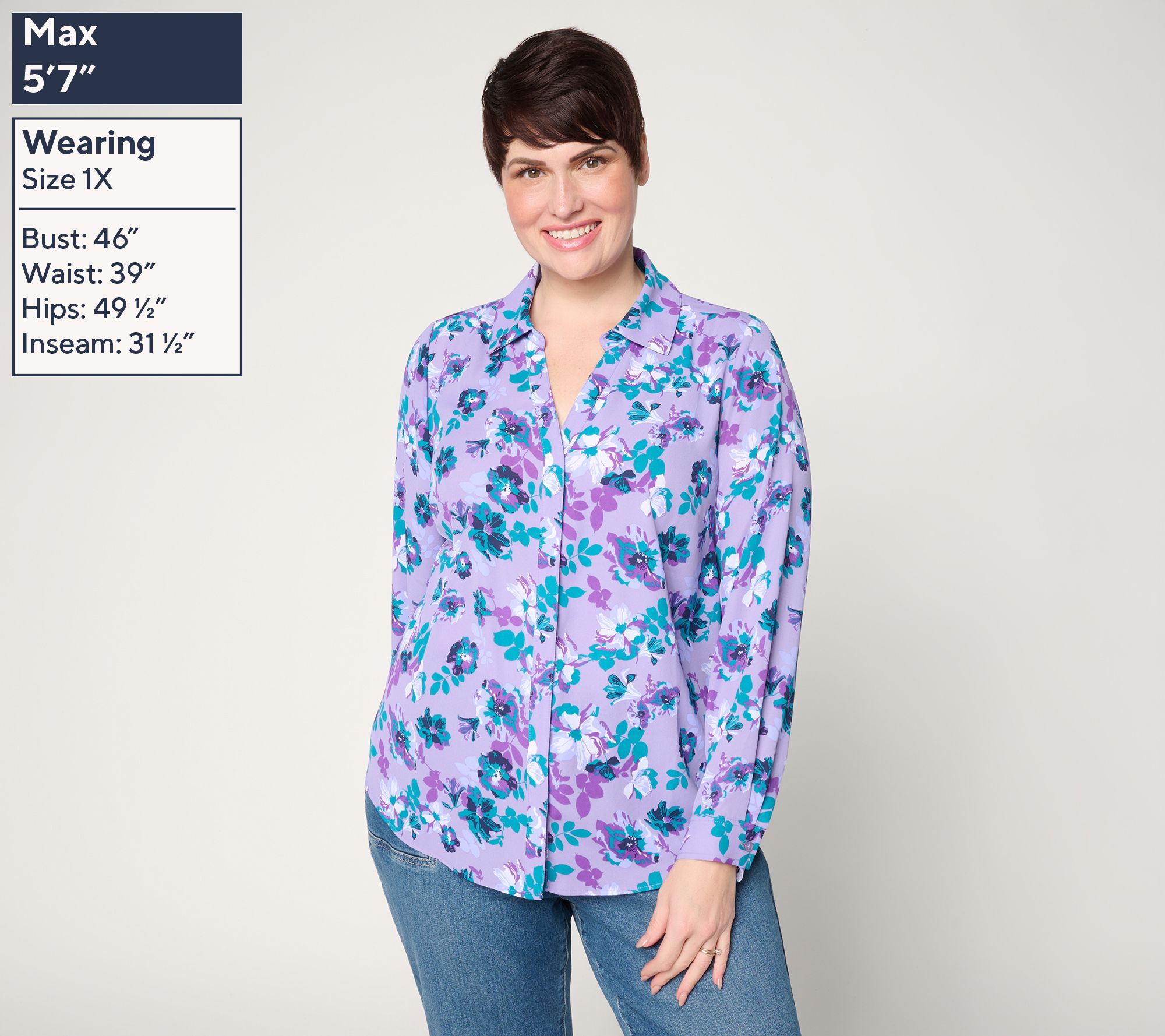 • Features: button-front closure with hidden placket, collar, V-neckline, side slits, shirttail hem, back box pleat, button cuffs