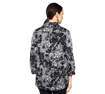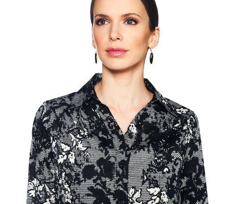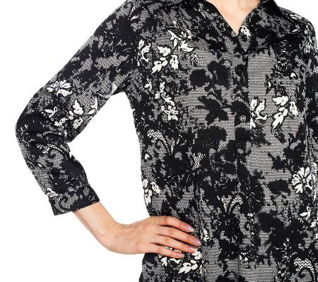 Take the relaxed look you love about menswear, add feminine twists like a digital lace-and-floral pattern, and emerge in this silky boyfriend shirt, rocking the best of both worlds with your flex appeal. From the Joan Rivers Classics Collection(R).