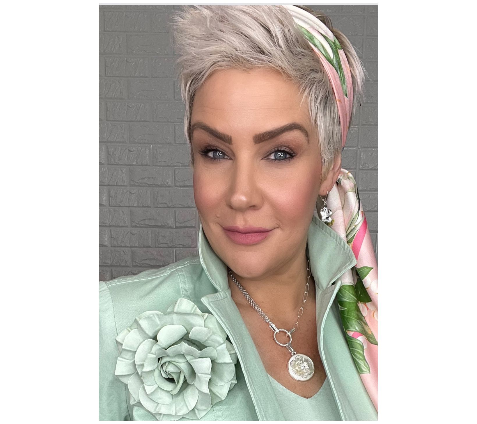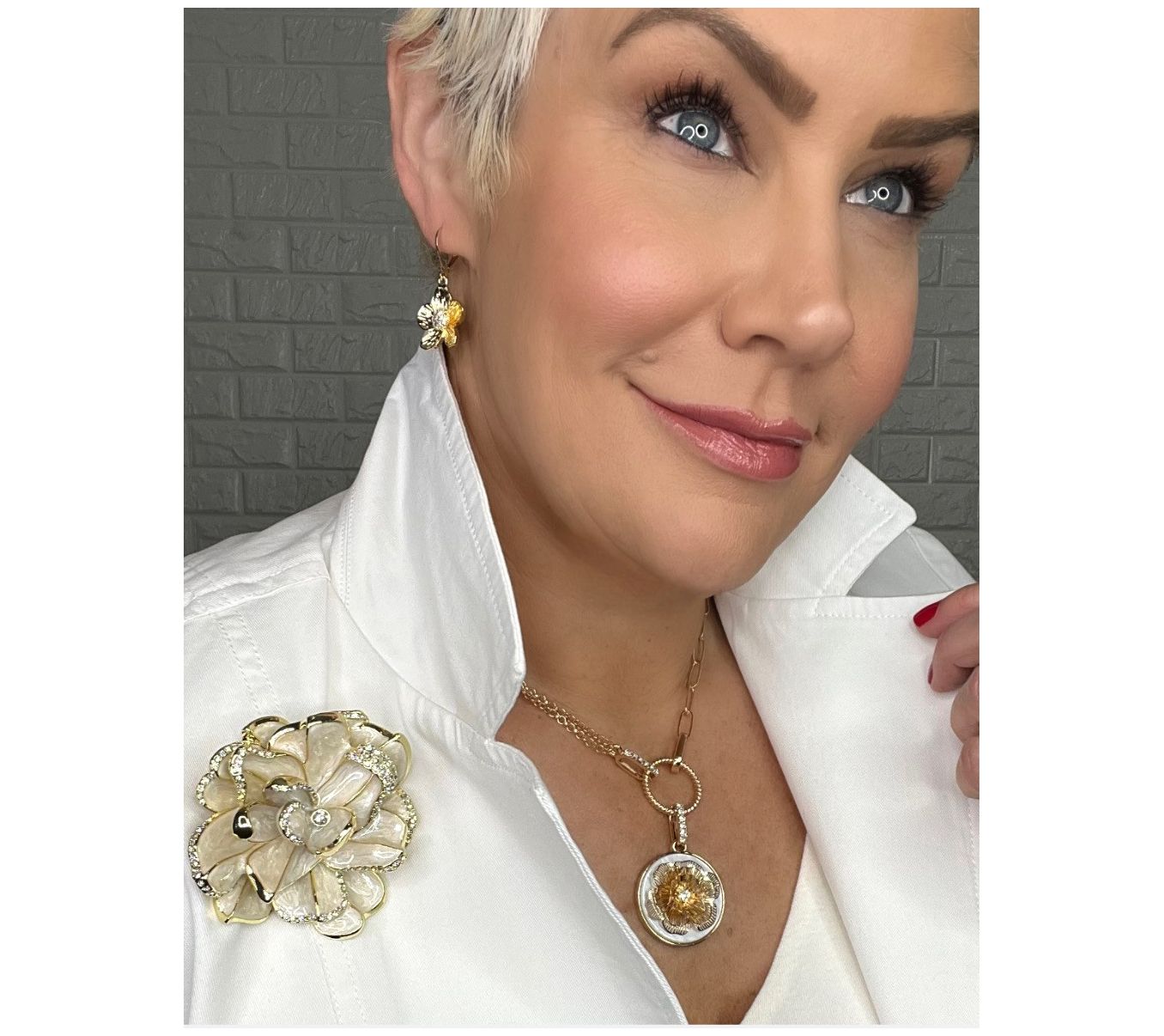 Raised metal gardenia on ivory-colored disc; crystal accents; rolo link chain on one side and paperclip chain on the other