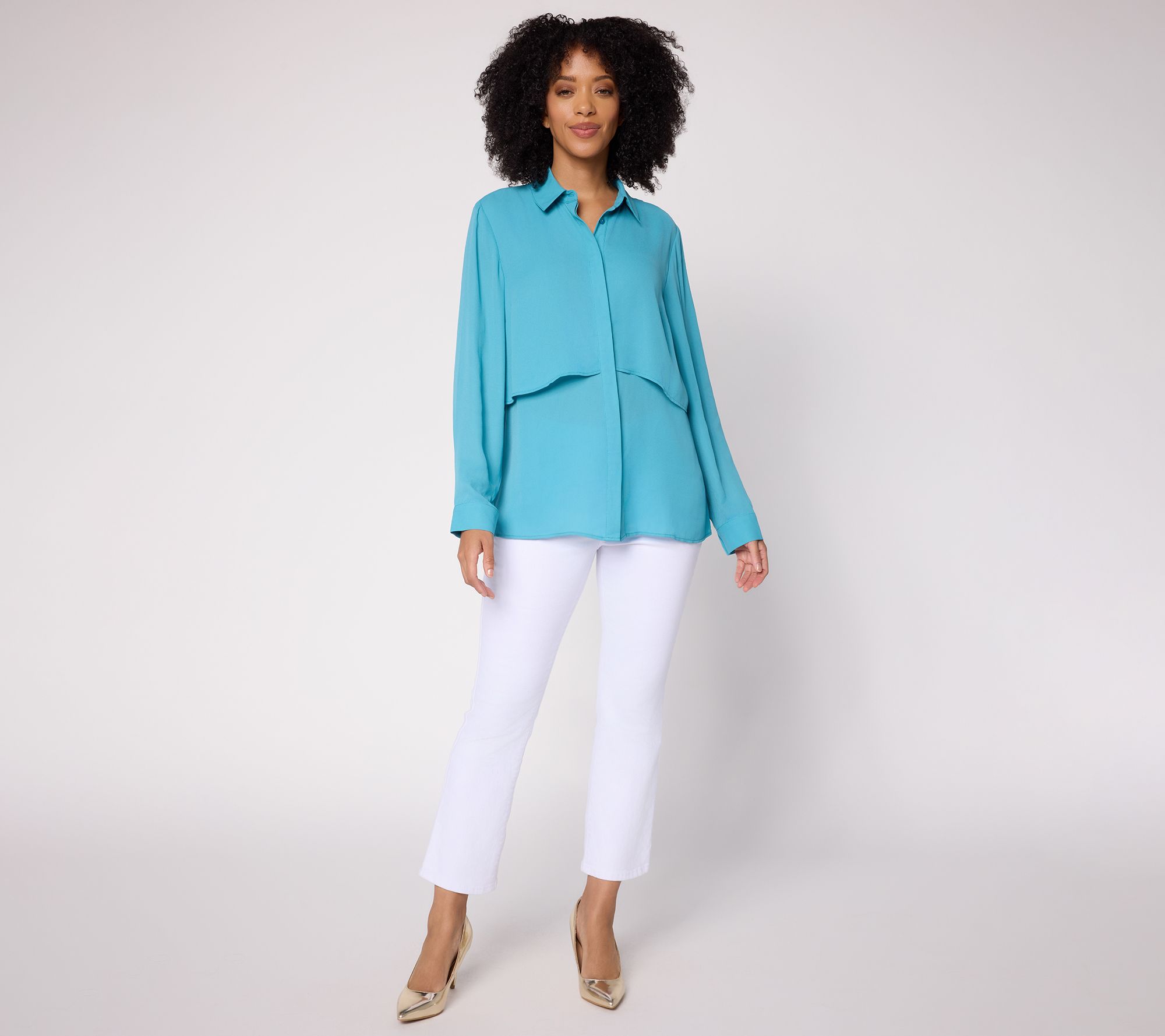 So floaty. So feminine. So fun. Crafted in a gorgeous georgette, this button-front shirt feels so refined -- with a floating layer featured on the front and back that ends midway. The drama continues with a flared A-line shape that glides over your curves. Long sleeves are finished with pleated button cuffs for extra elegance. From the Joan Rivers Classics Collection®.