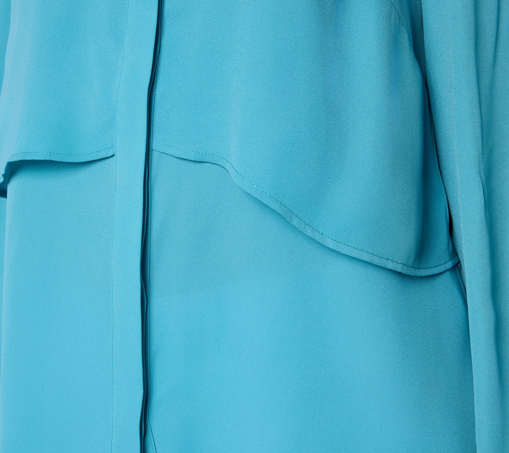 Features: long sleeves with pleat and button cuffs, button-front closure with hidden button placket, layered front, finished collar, bust darts, front and back floating outer layer set in at neck