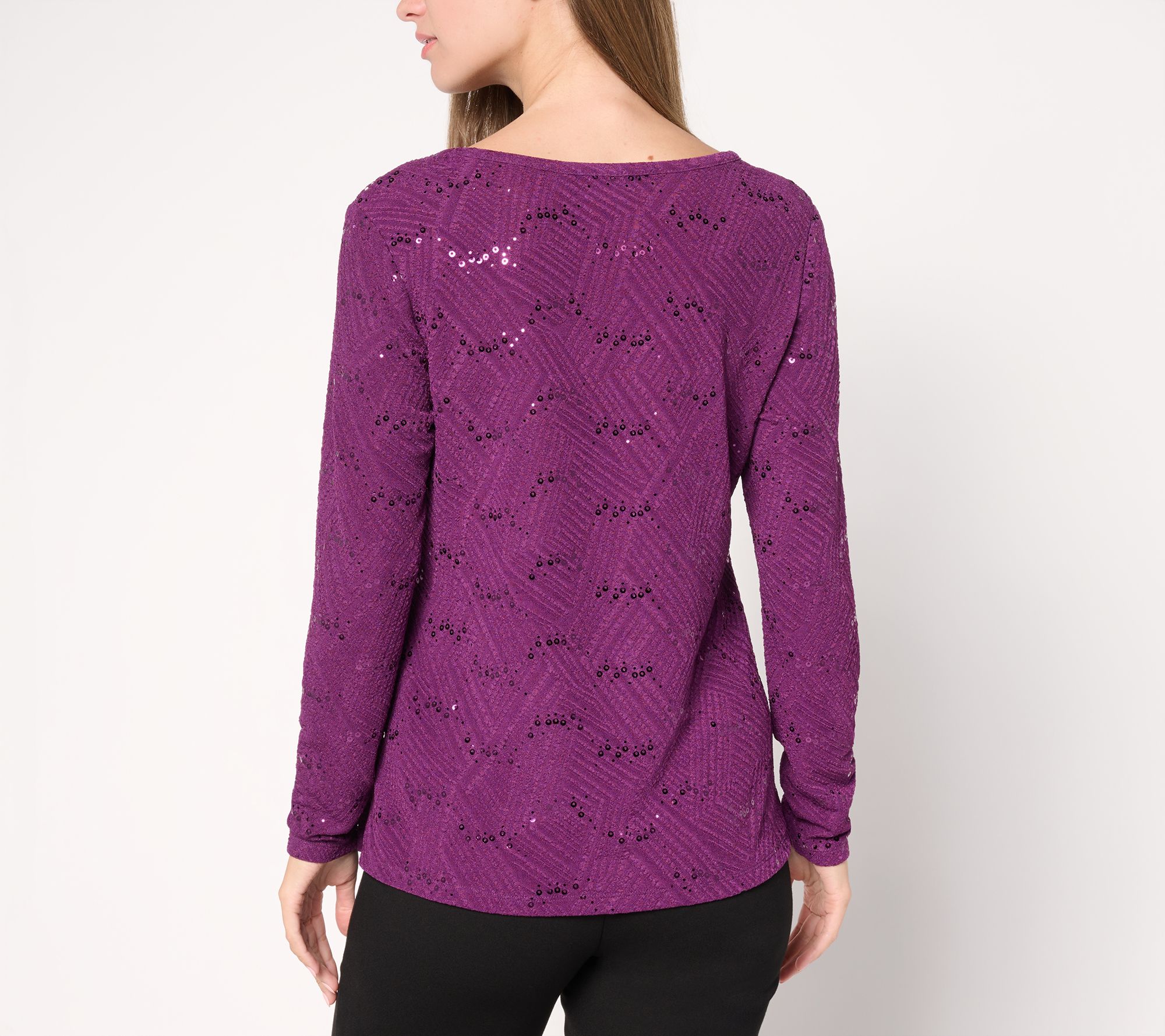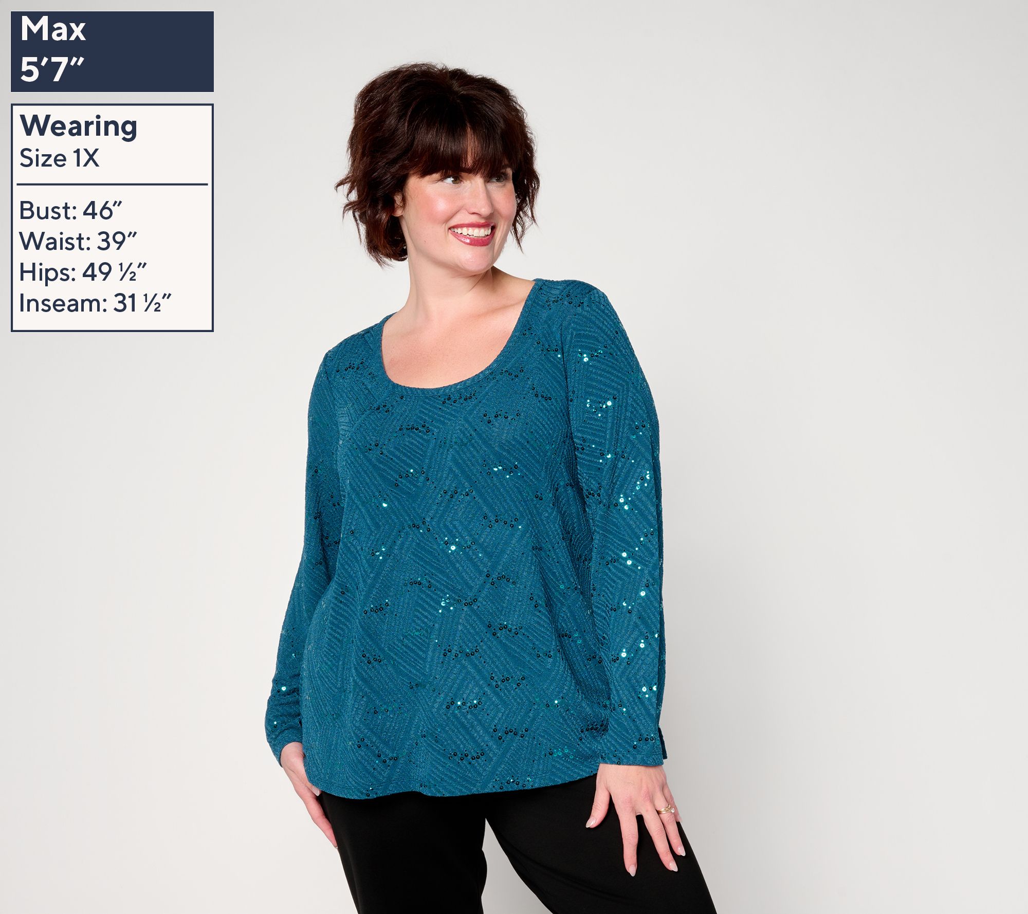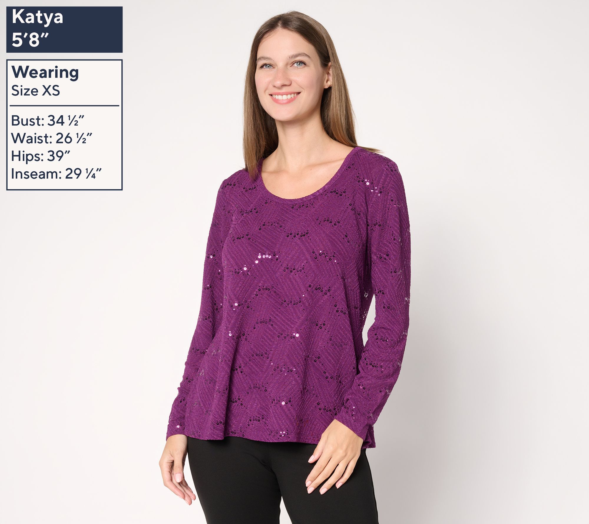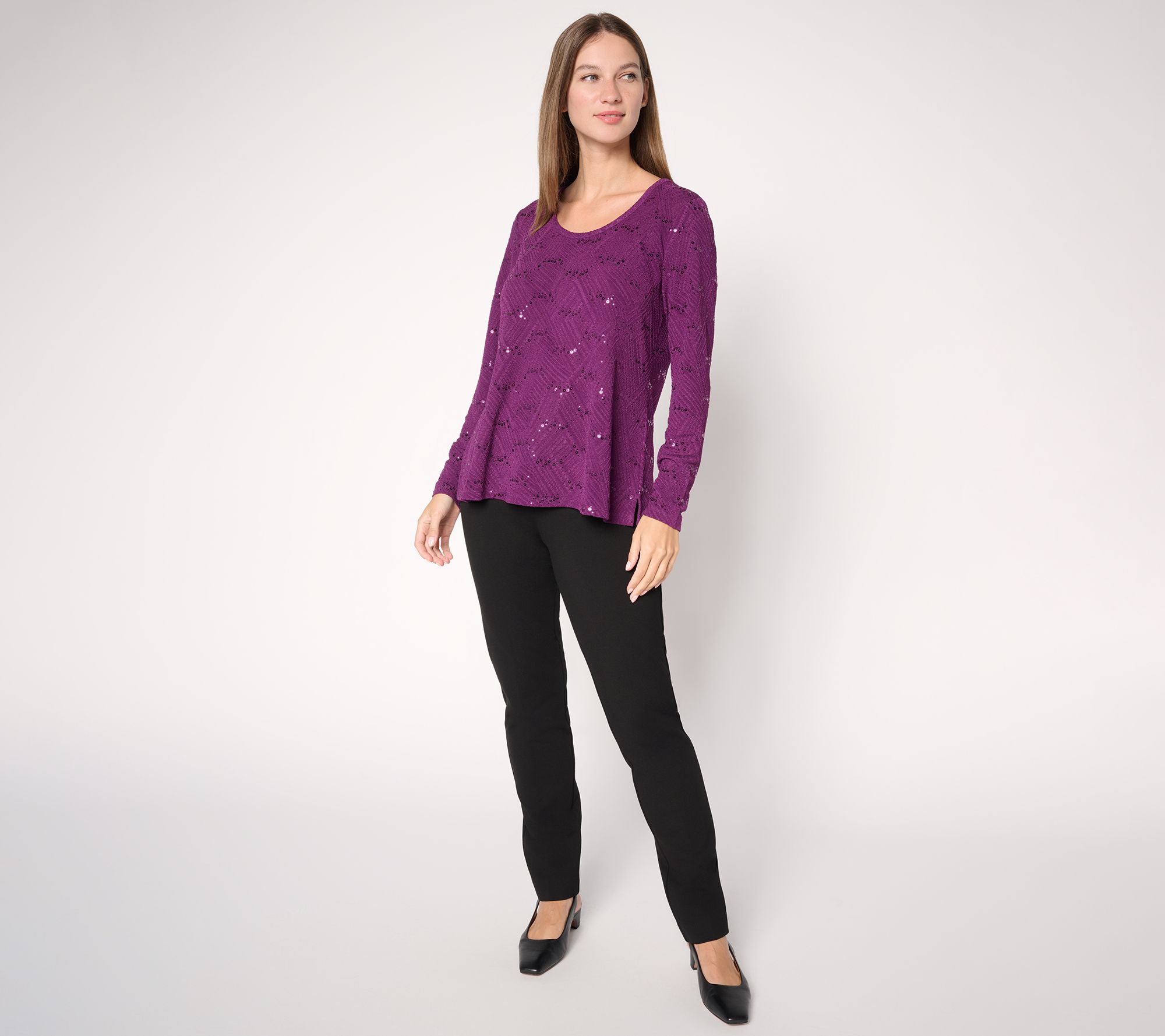 Your day just got a little brighter with this knit jacquard scoopneck top -- effortless to wear for dressy dinners, weekend getaways, and worship. The graceful neckline and long sleeves flatter every silhouette, while soft stretch lets you move with ease as you layer for work or keep it casual over leggings. From the Joan Rivers Classics Collection®.