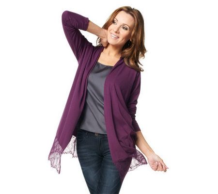 A feminine touch. Lace trim along the hemline of this open-front cardigan makes it the perfect way to top off a number of looks, from casual to dressy. From the Joan Rivers Classics Collection(R).