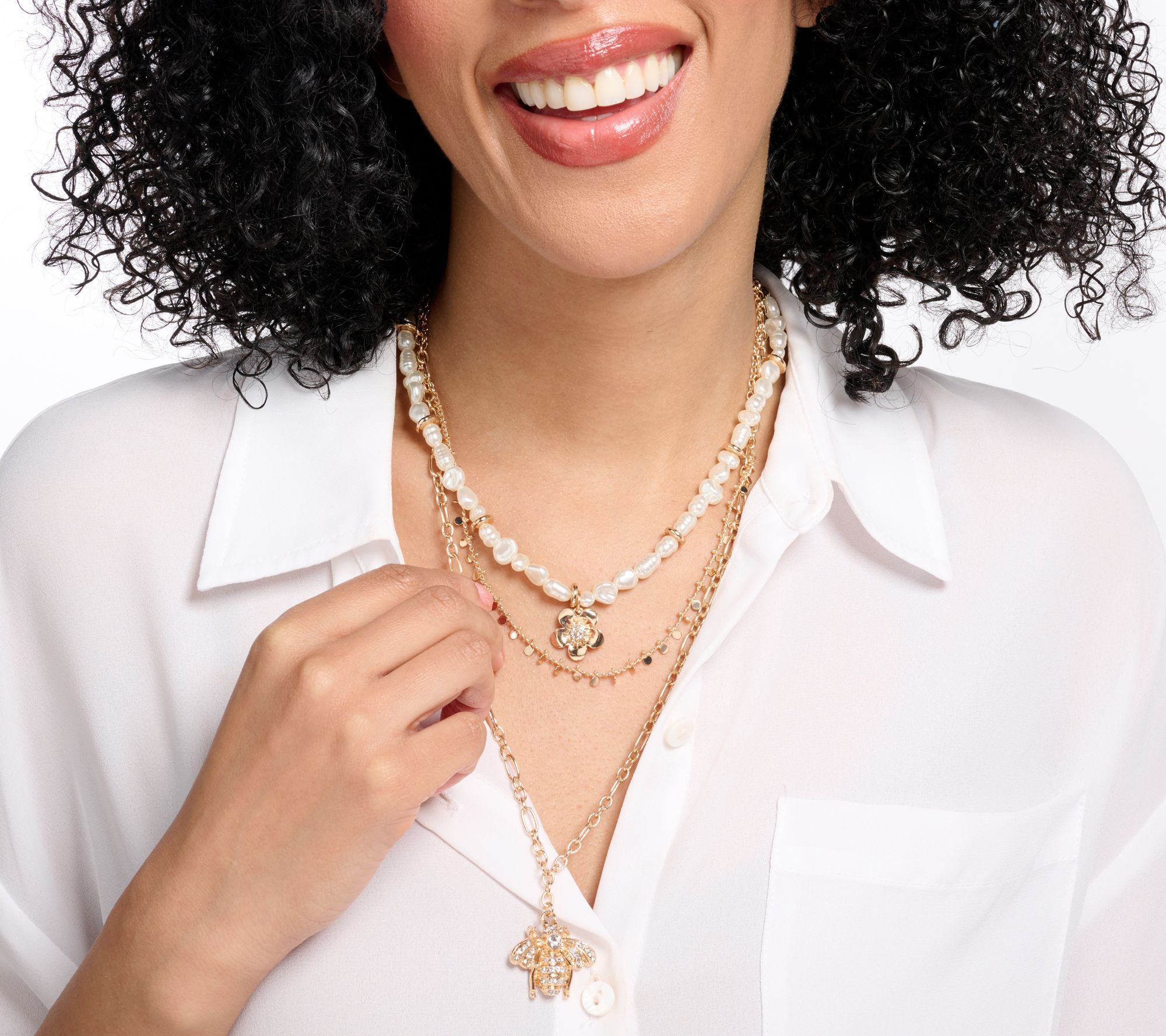 Three nested layers of chains and faux pearls; pave bee charm; flower charm with center crystal