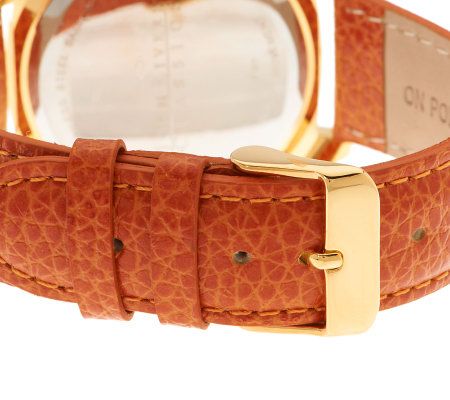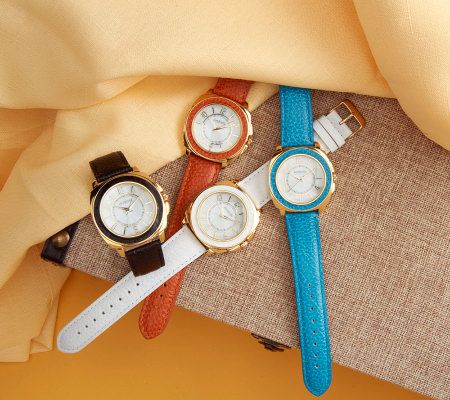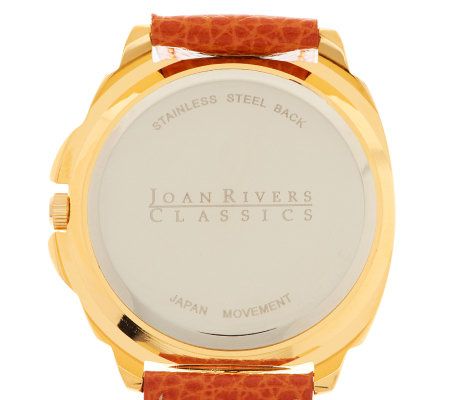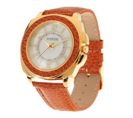 It's about time--and classic style. Watches aren't just for telling time anymore; they're accessories that offer both fashion and function, and this timepiece gives you plenty of both. It presents a mother-of-pearl face with goldtone numbers, as well as a pebbled leather strap and leather detail along the bezel. From Joan Rivers Classics Collection.