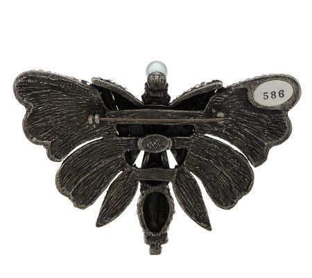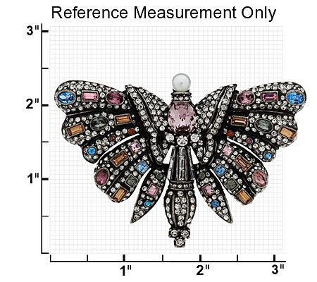 • Butterfly design with open wings; body and wings completely embellished with various shapes and colors of crystals; white simulated pearl head; oxidized finish