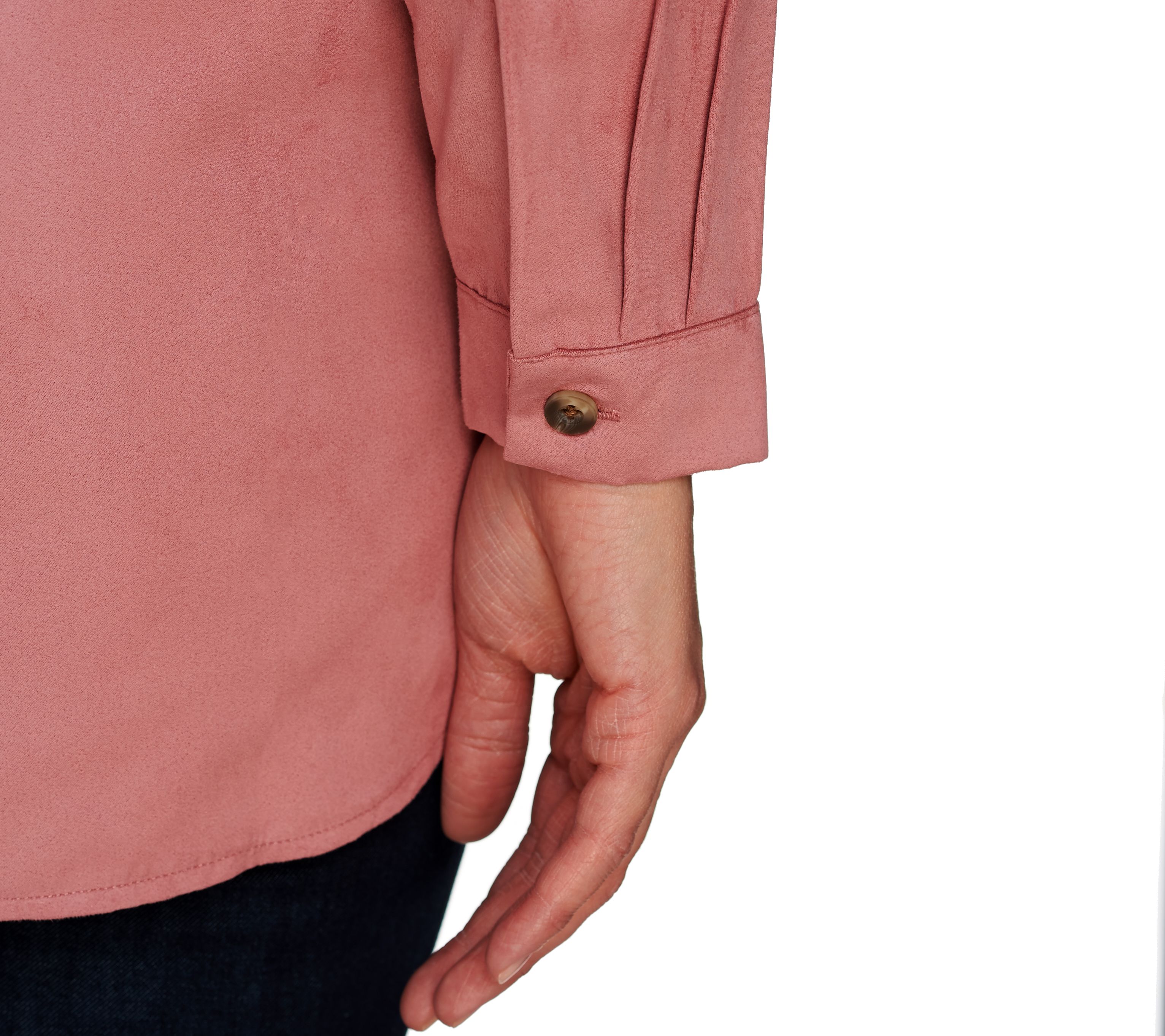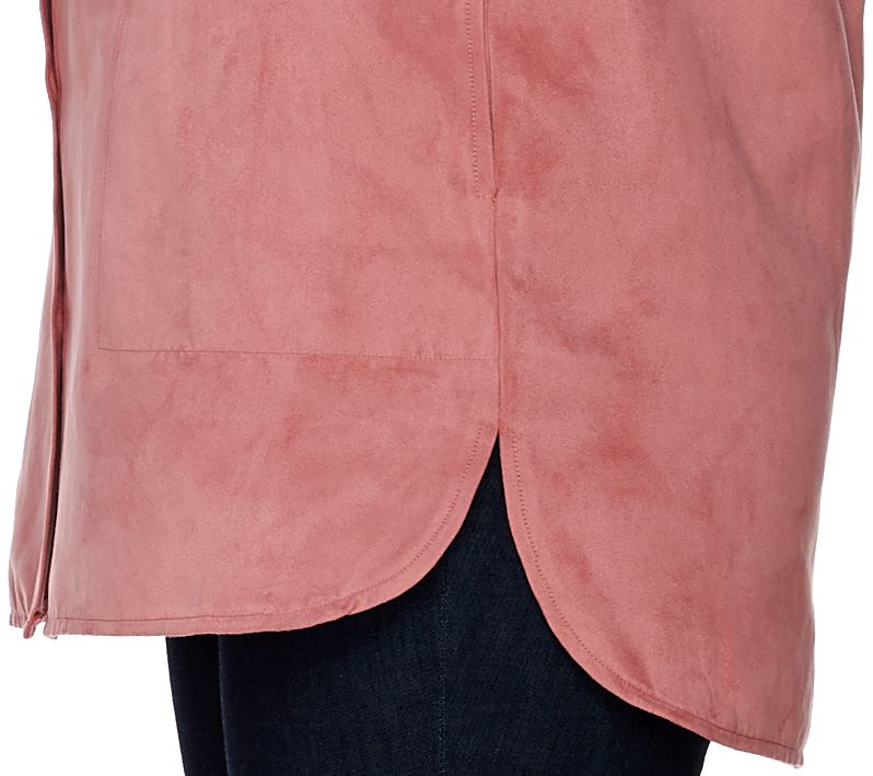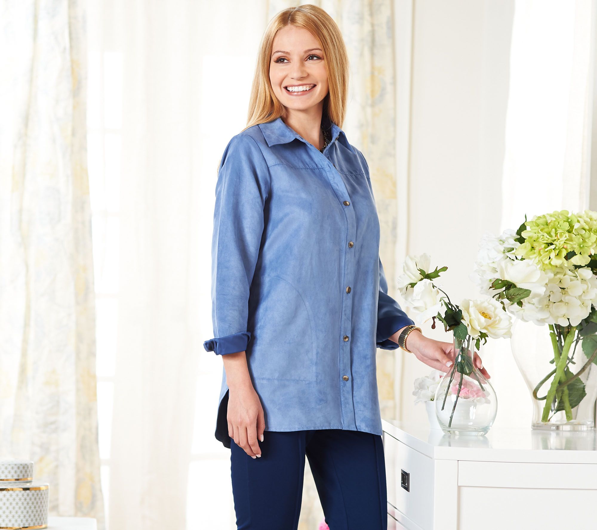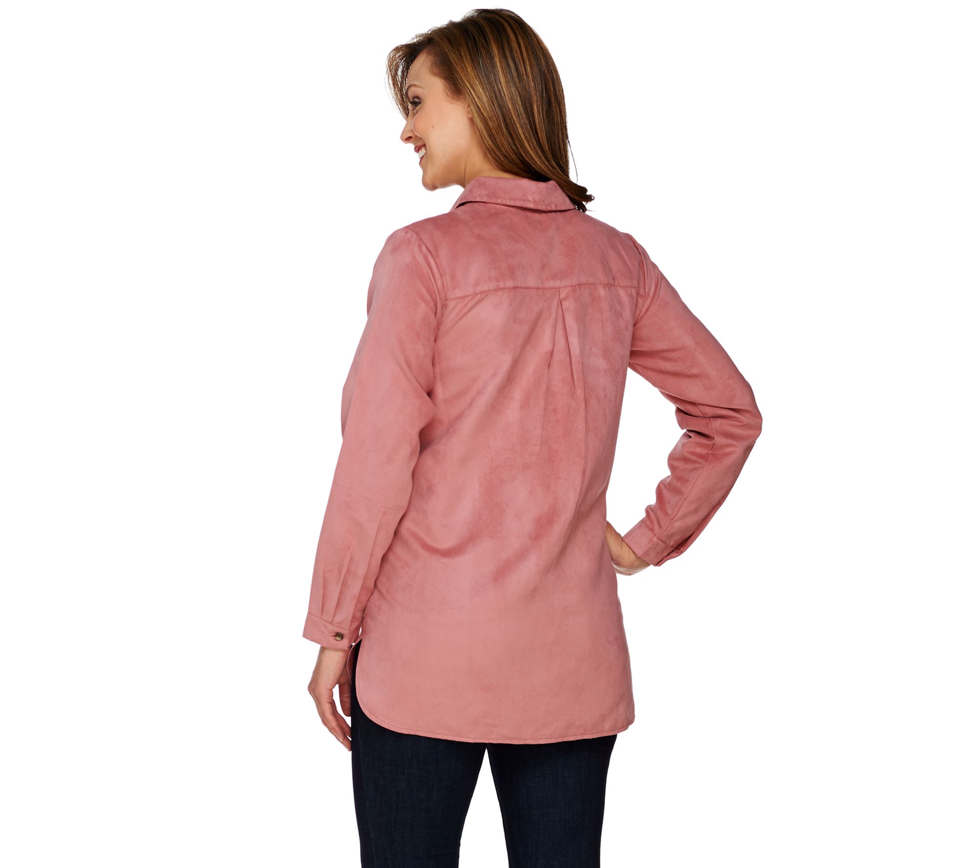 Hello, Mr. Right! This Joan Rivers faux-suede boyfriend shirt will be quick to steal your heart with its casual, comfortable, and classic look. Pair this stylishly sensible top with anything from skinny jeans to leggings for an outfit that looks and feels fabulous--and the possibilities don't end there. Accessorize it with a bold statement necklace, or cuff the sleeves to reveal your favorite watch or bracelet. You'll fall head over heels for this versatile, on-trend top time and time again. From the Joan Rivers Classics Collection(R).