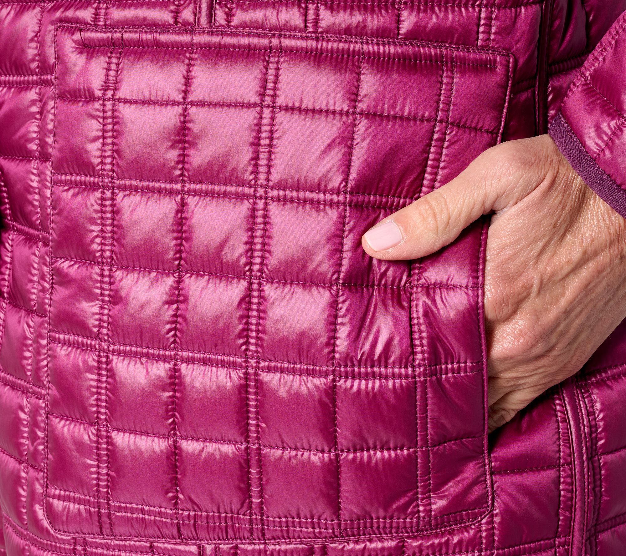 Features: reversible matte-to-pearl design, quilted, snap closure, front and back princess seams, rib binding details, front patch pockets on one side and side pockets on reverse side, stand collar, straight hem