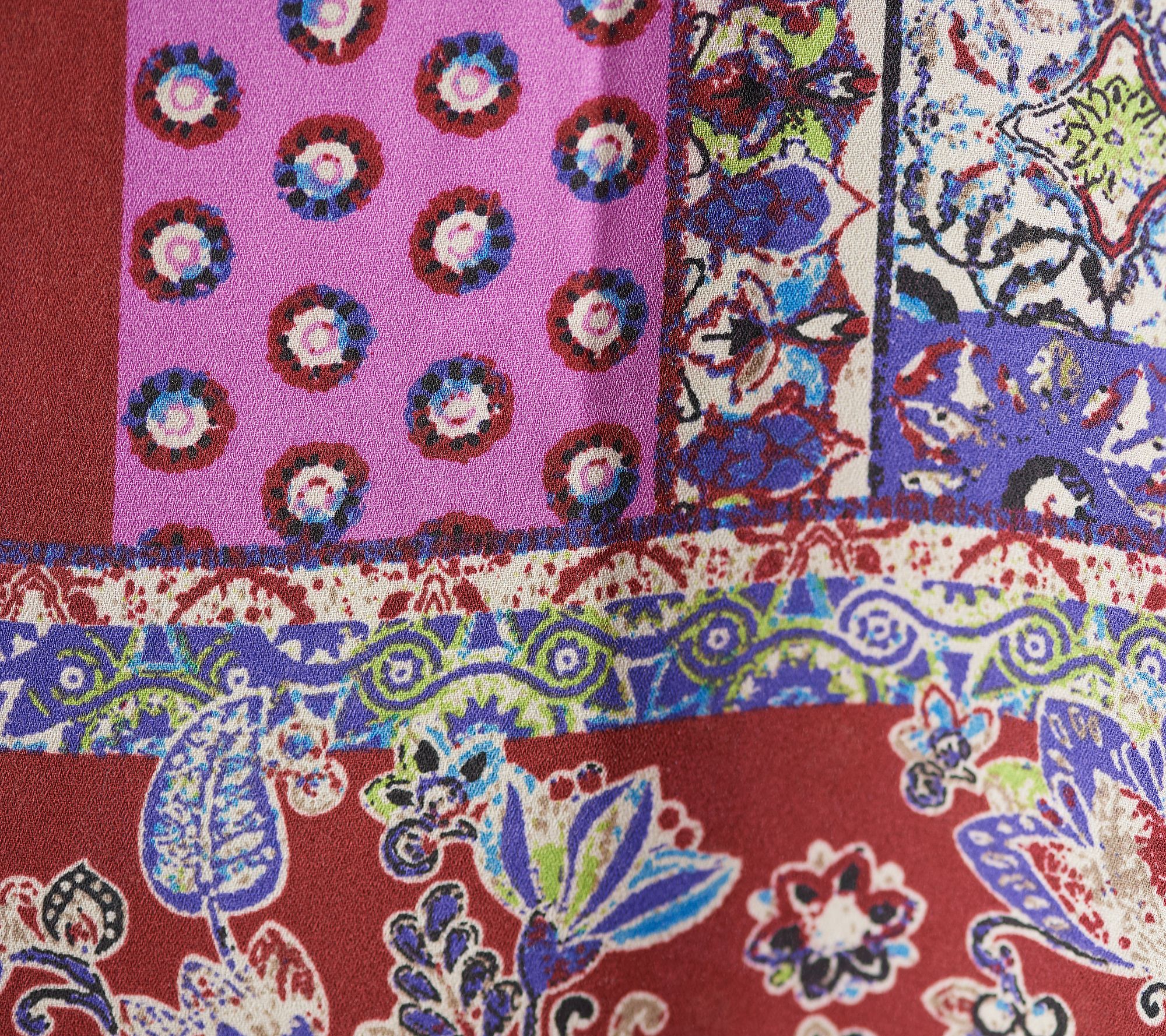 Features: patchwork printed fabric, button-front closure, banded V-neckline with collar, back yoke with inverted pleat, long sleeves with button cuffs, curved hemline