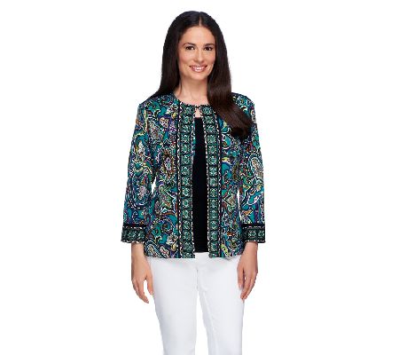 Make a statement with the bright colors and paisley print of this knit jacket. From the Joan Rivers Classics Collection(R).