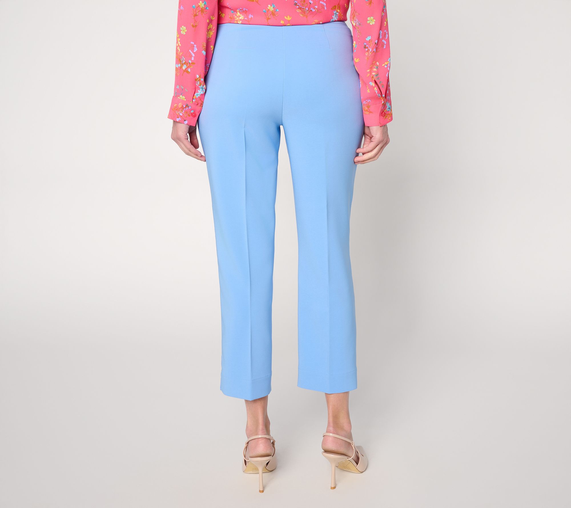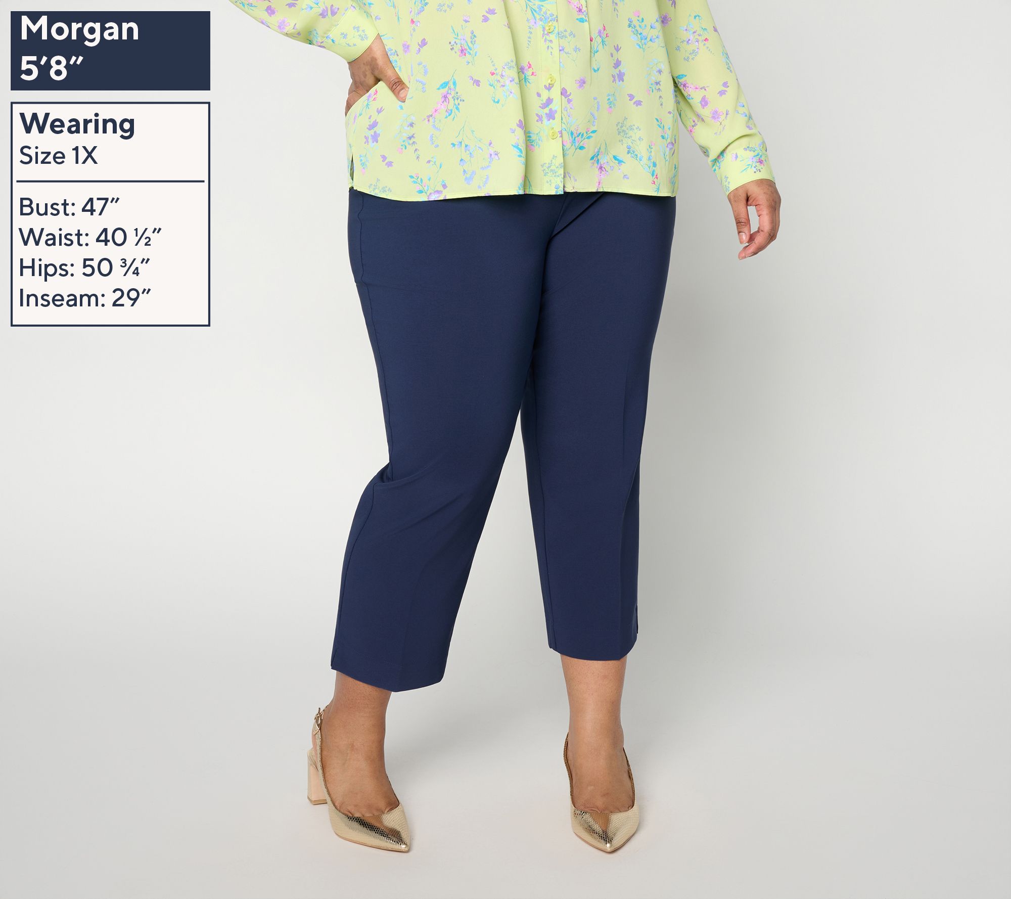 Your calendar's full, your to-do list is long -- and these crop pants are here to keep pace! How? The bi-stretch twill flexes right along with you, so whether you're working or weekend-ing, you'll look polished without missing a beat. A subtle front and back leg crease keeps things looking tailored, while a comfy pull-on fit makes them a joy to wear. Flexible, flattering, and fabulous -- consider your busy-day wardrobe handled. From the Joan Rivers Classics Collection®.