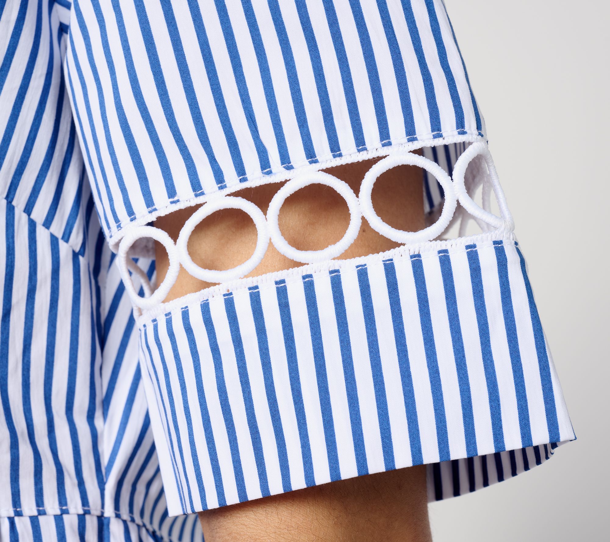 Features: collar neckline; button-front closure; shirred circle-lace-trimmed short sleeves, back yoke, and waist seam; on-seam pockets; circle lace-trimmed bottom tier