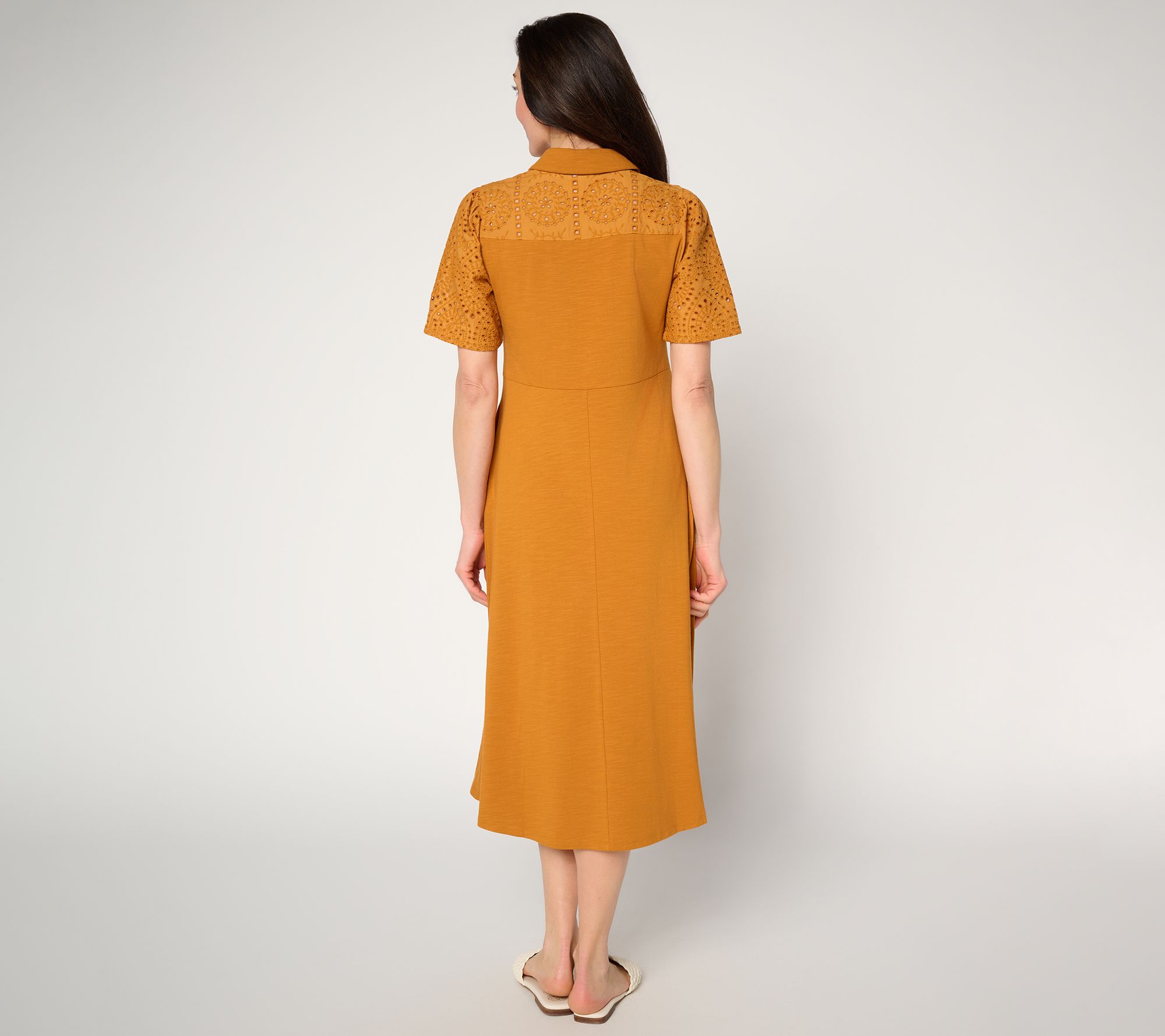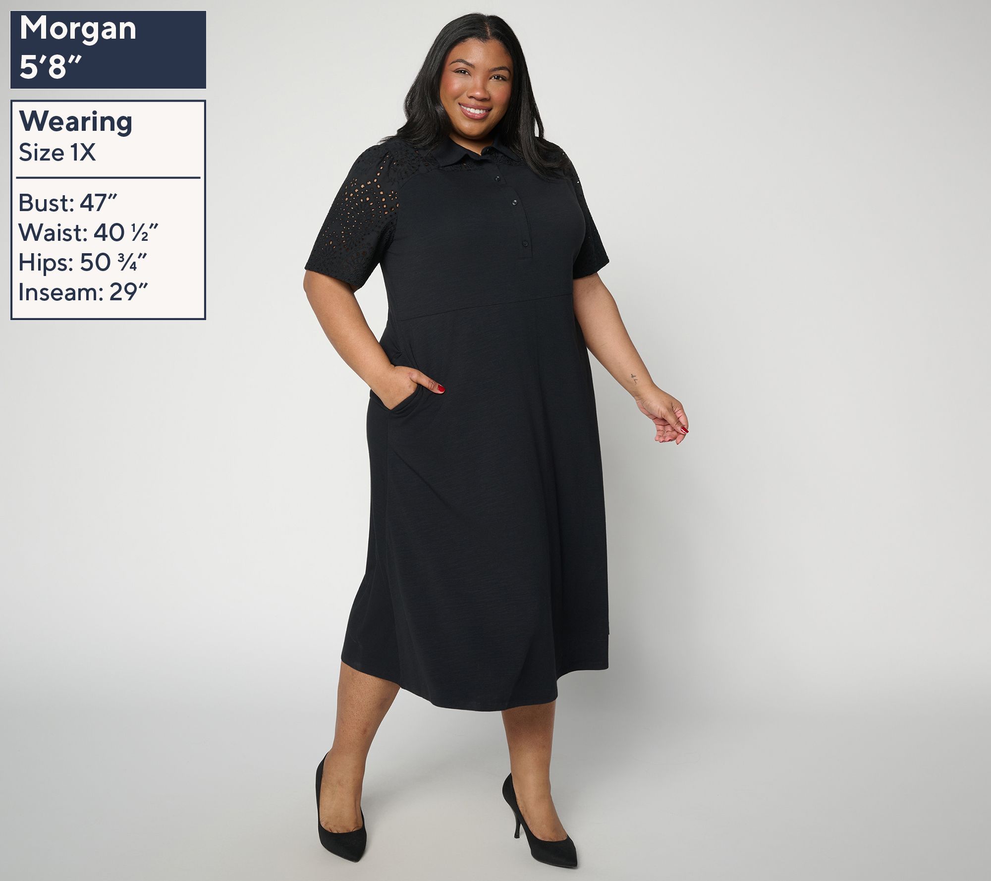 Delightfully one and done! The stretch-knit fabrication and charming eyelet sleeves of this short-sleeve Henley dress make it a versatile choice for warm-weather routines, from lunch dates to weekend getaways to worship. Just add your favorite jewelry and sandals (or cute sneakers). From the Joan Rivers Classics Collection®.