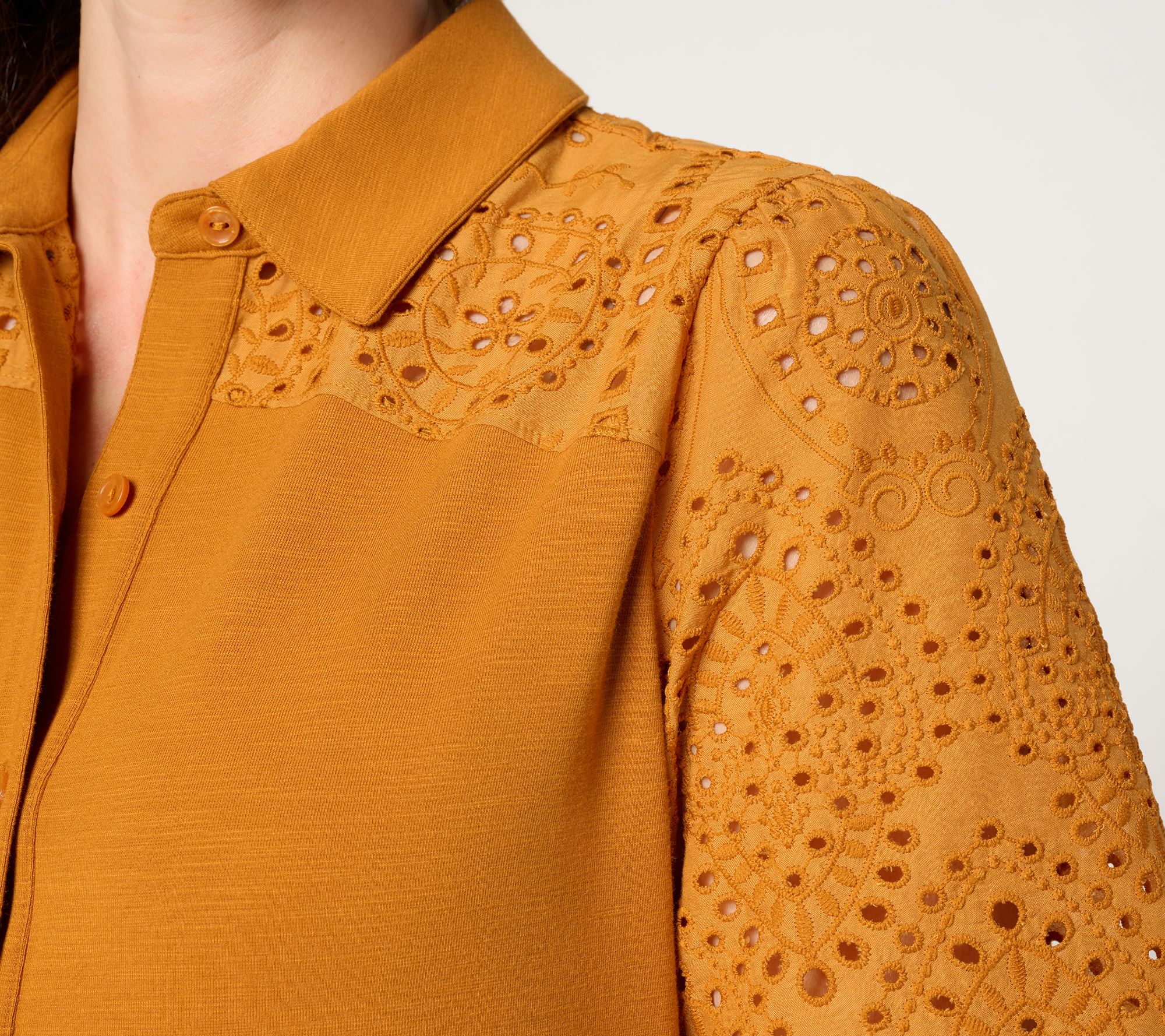 Features: button-front Henley placket, eyelet lace short sleeves and yoke, slightly shirred sleeve caps, midi length