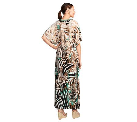 Every day is like an exotic escape when you don this zebra-print caftan. Beading along the V-neckline and short batwing sleeves add to its glamorous look. Who needs an expensive getaway when you can transport yourself with this captivating caftan? From the Joan Rivers Classics Collection(TM).