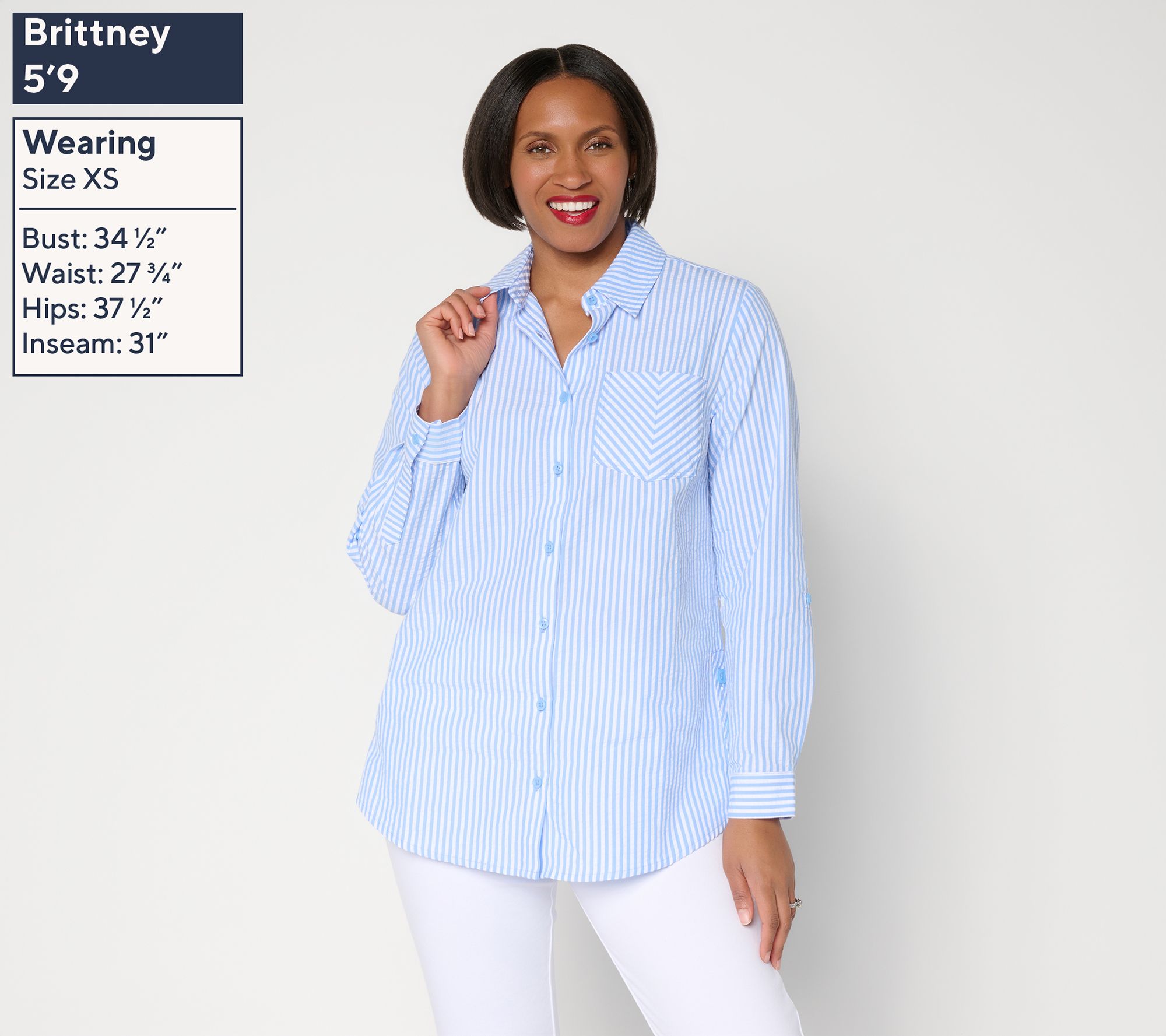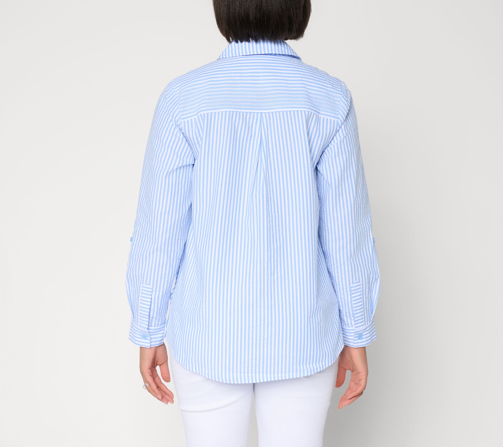 Ready for everything from long workdays to impromptu dinners, this seersucker boyfriend shirt keeps you cool and comfortable while looking put-together. Versatile design details -- like a chest pocket, roll-tab sleeves, and a shirttail hem -- make it easy to style up or down for countless occasions. From the Joan Rivers Classics Collection®.