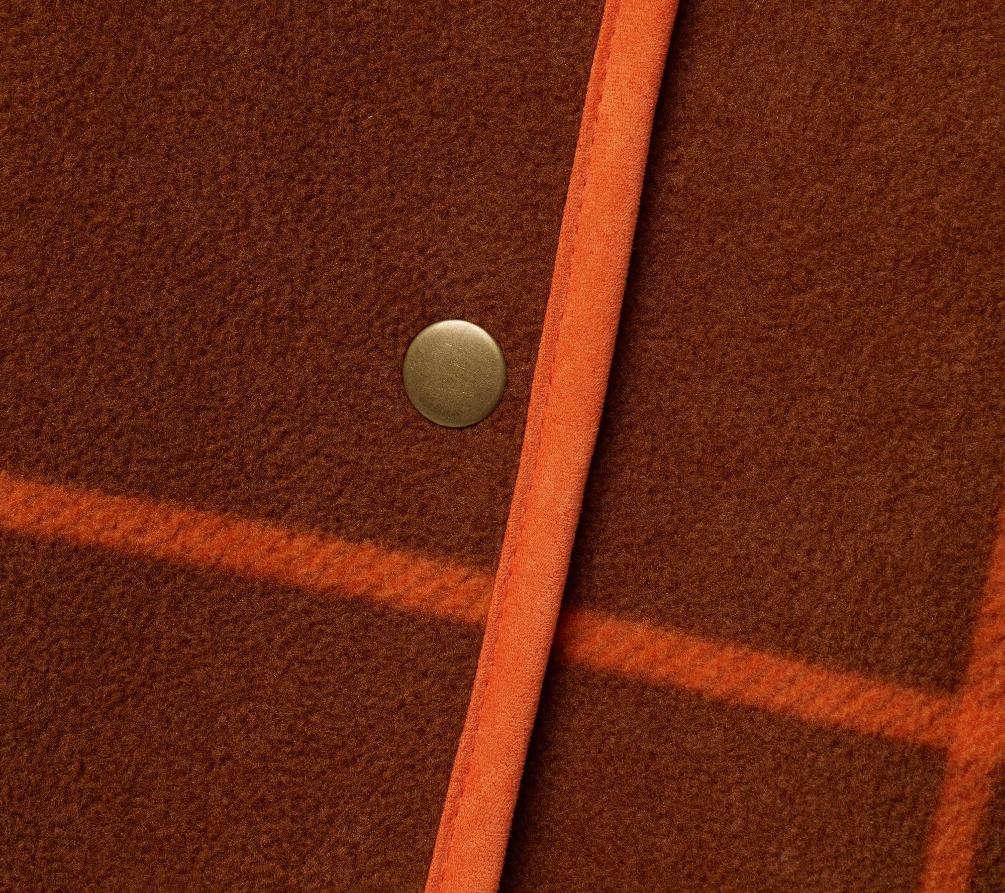 Features: reversible Sherpa and printed fleece, plaid side, solid side, snap front-closure, collar, contrast piping on collar, sleeve and bottom opening, welt pocket, straight hem