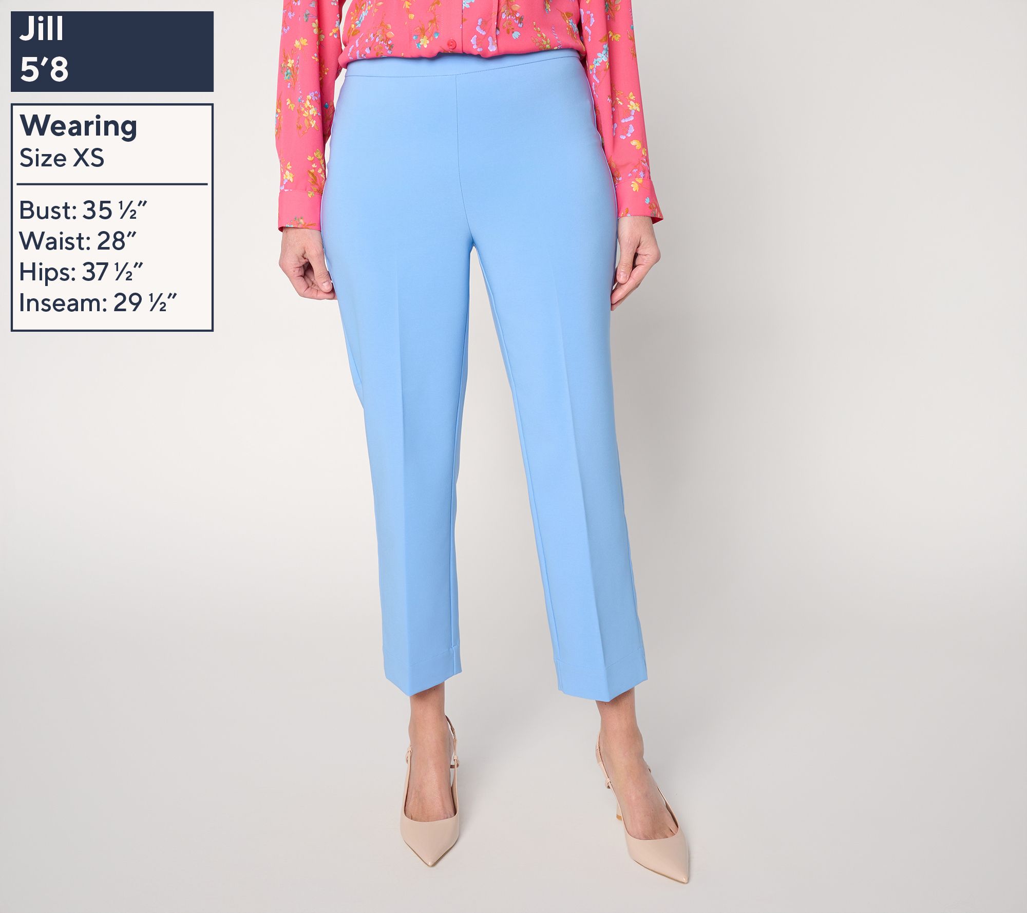Features: pull-on style, elastic inside, back darts, crease detail on front and back leg, side slits, crop length