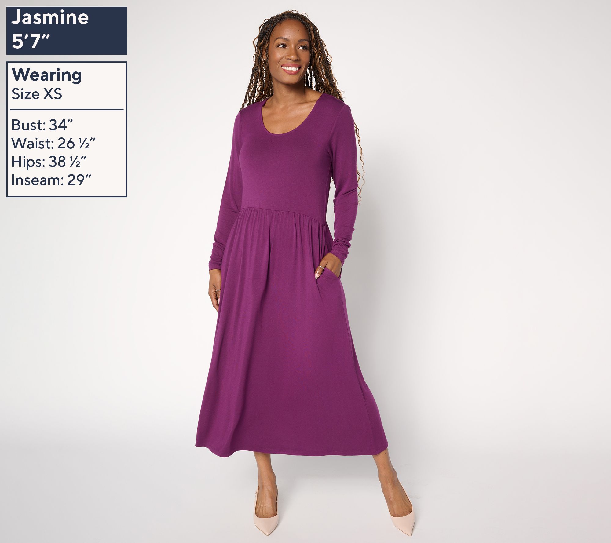 • Features: scoop neckline, long sleeves, midi length, shirring at waistband, side pockets