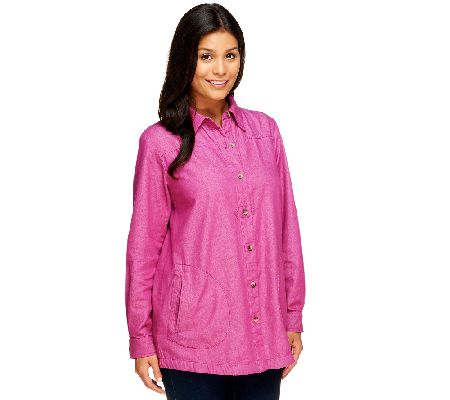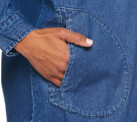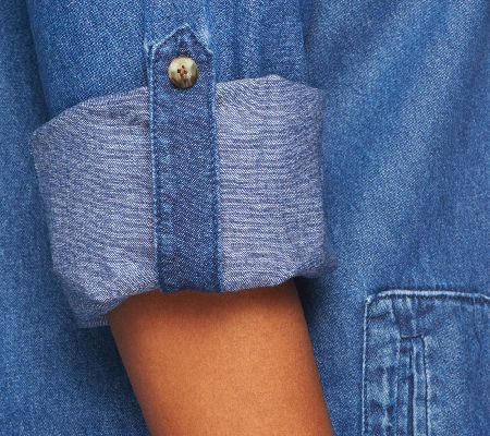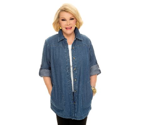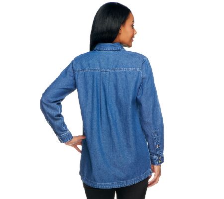 Stand by your style. When you want to give your modern look a classic touch, choose this denim boyfriend shirt. Its simple button closure paired with a traditional collar creates a fashion statement that's worth remembering. Menswear-inspired with a decidedly feminine feel, this shirt pairs perfectly with leggings and skinny bottoms. From the Joan Rivers Classics Collection(R).
