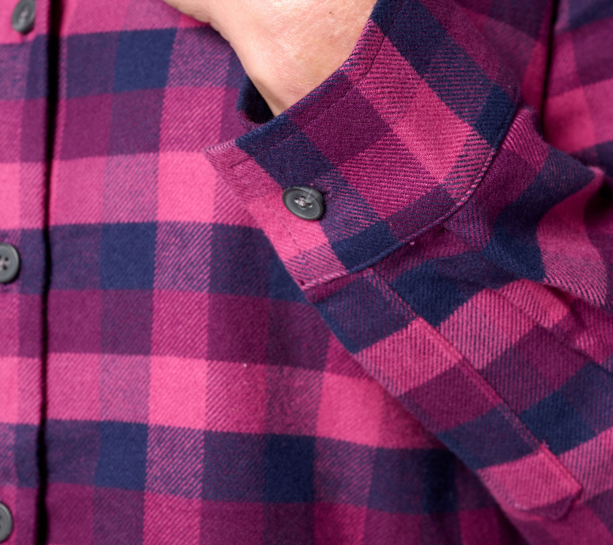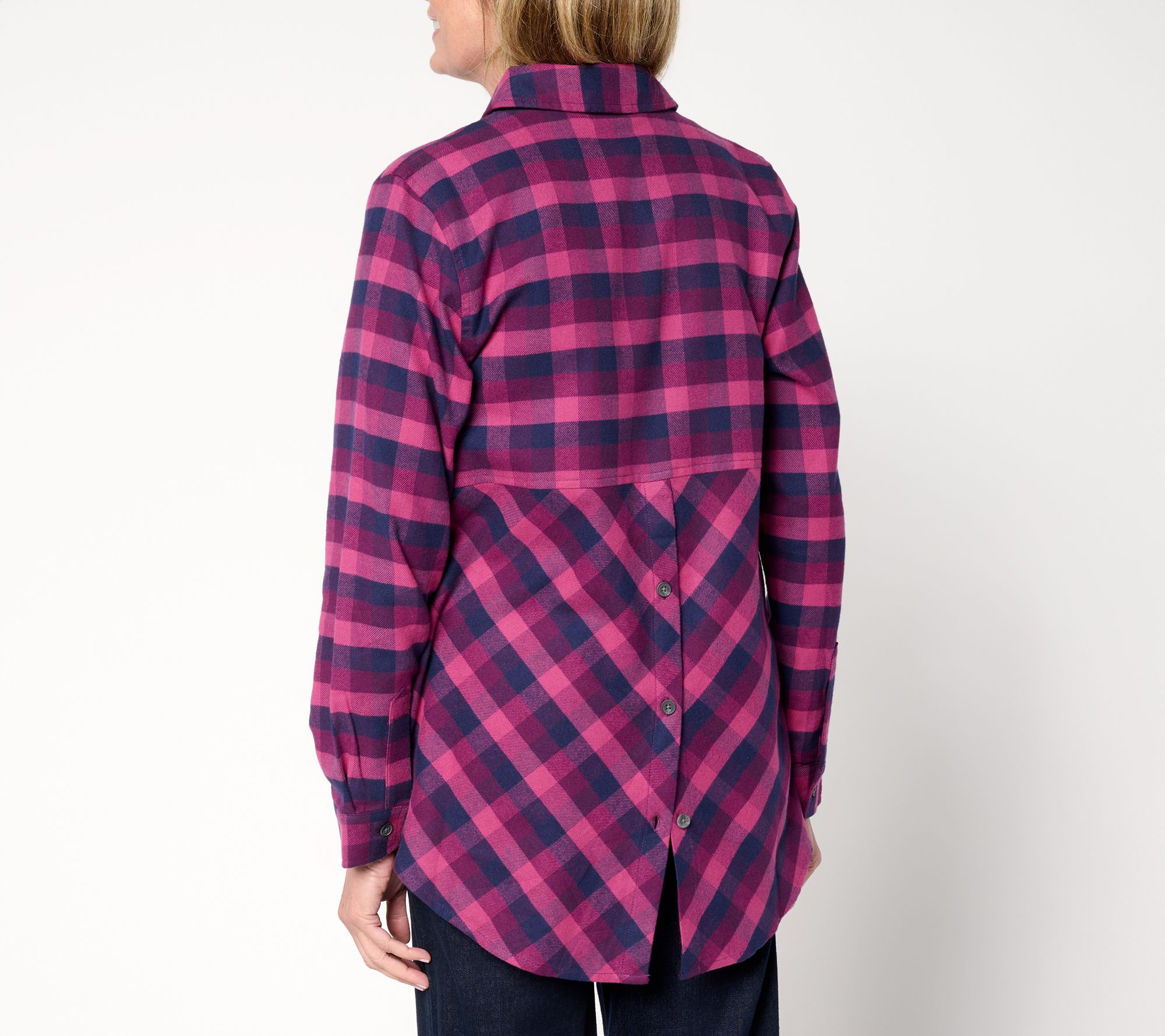 A buffalo check flannel shirt in 100% cotton brings warmth and charm to everyday routines, whether styled with leggings for morning errands or layered under a vest for crisp afternoons. Fun back buttons and a gently shaped silhouette offer an elevated twist, while the hi-low hem creates visual interest as you move through your day. From the Joan Rivers Classics Collection®.