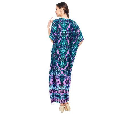Beachy keen. Whether you're relaxing on sandy shores or just lounging about the house, maintain your fashionable edge in this V-neck caftan. Covered in an eye-catching vintage-style scroll pattern, it's sure to add some oomph your look. From the Joan Rivers Classics Collection(TM).