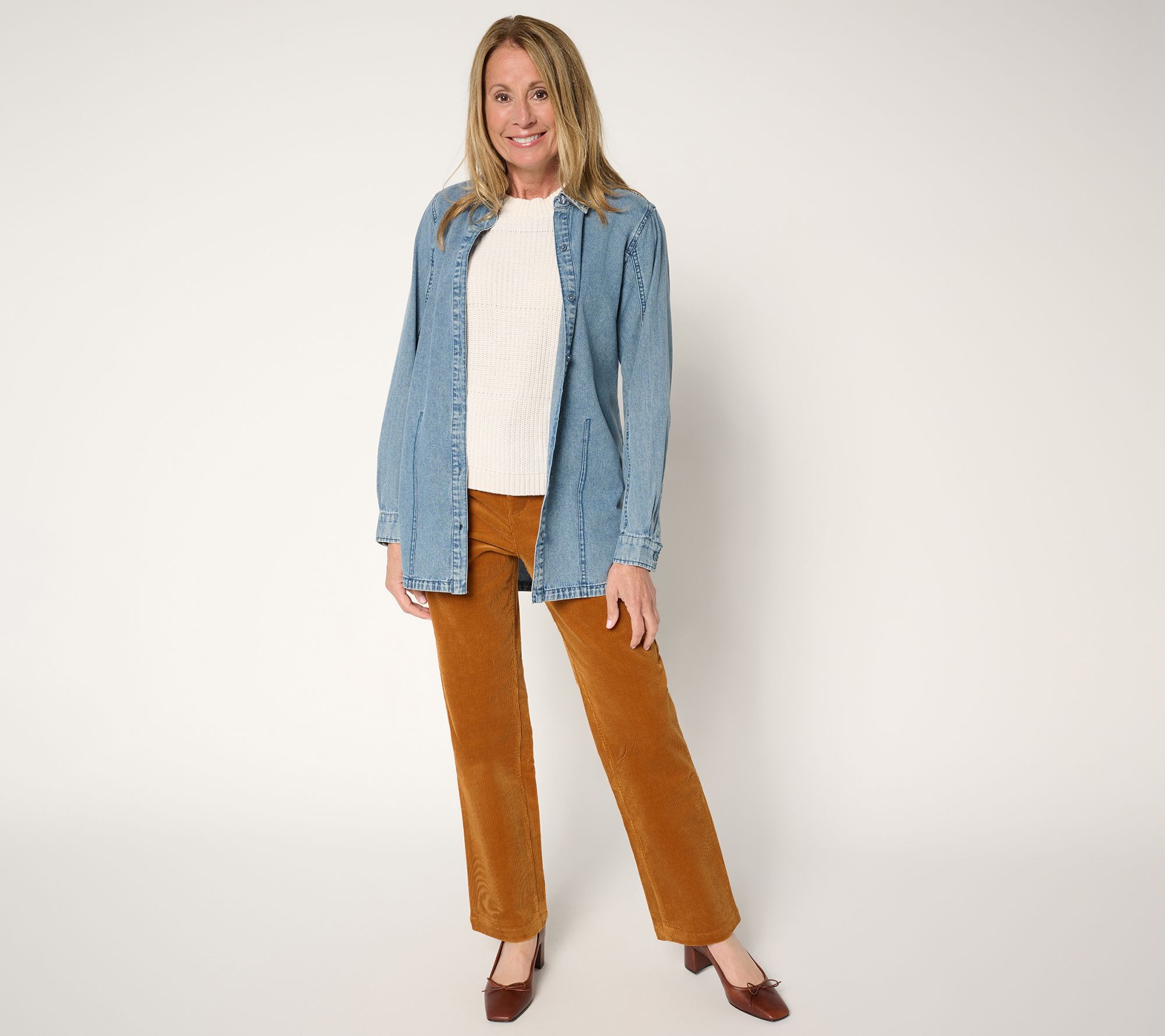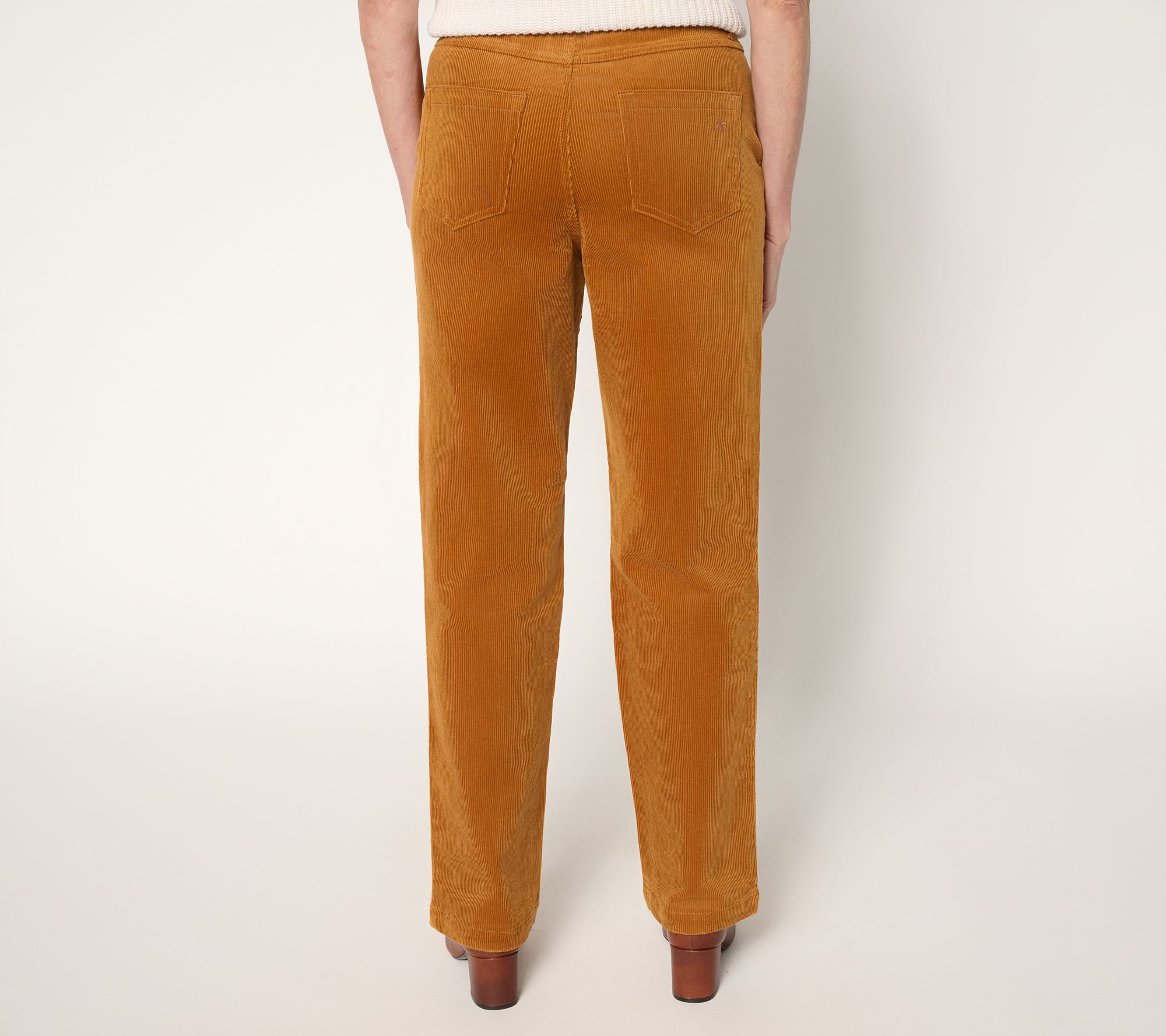 Replace those scratchy, itchy corduroy pants of yesteryear with this soft stretch pair and see the difference. Cut to follow the lines of the body and then fall straight from the knee to the leg opening, they go great with a flannel shirt and ankle boots. From the Joan Rivers Classics Collection®.