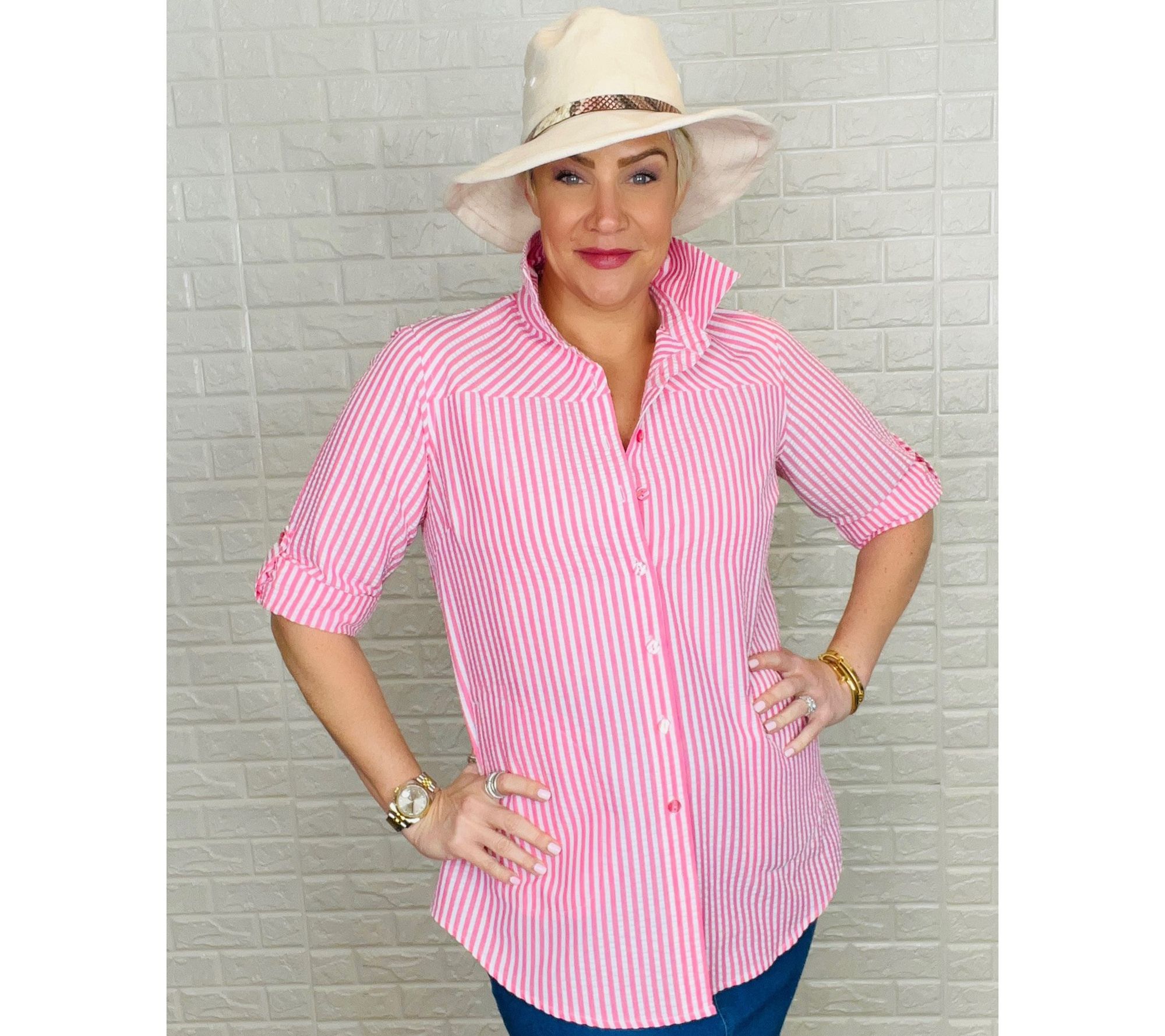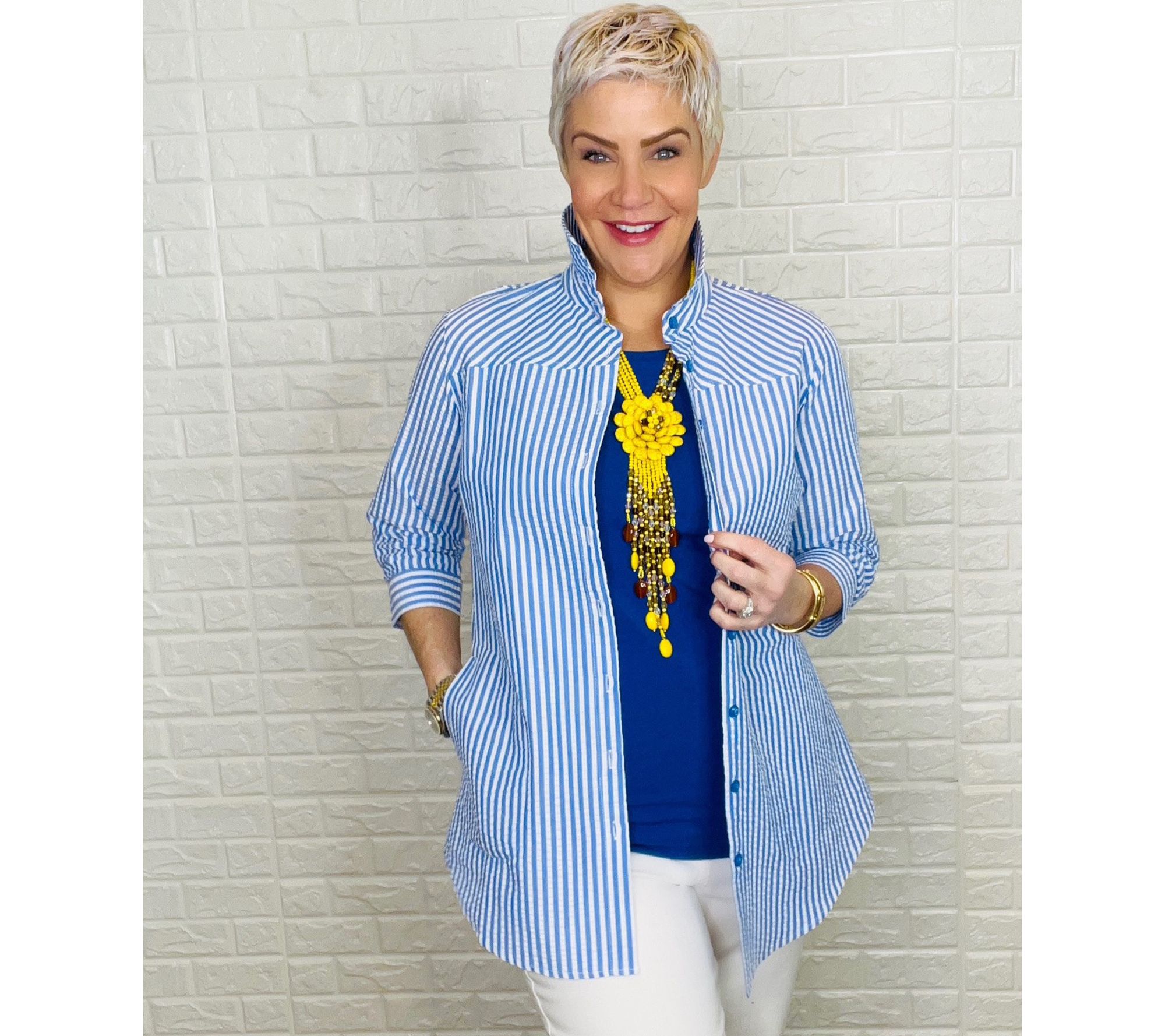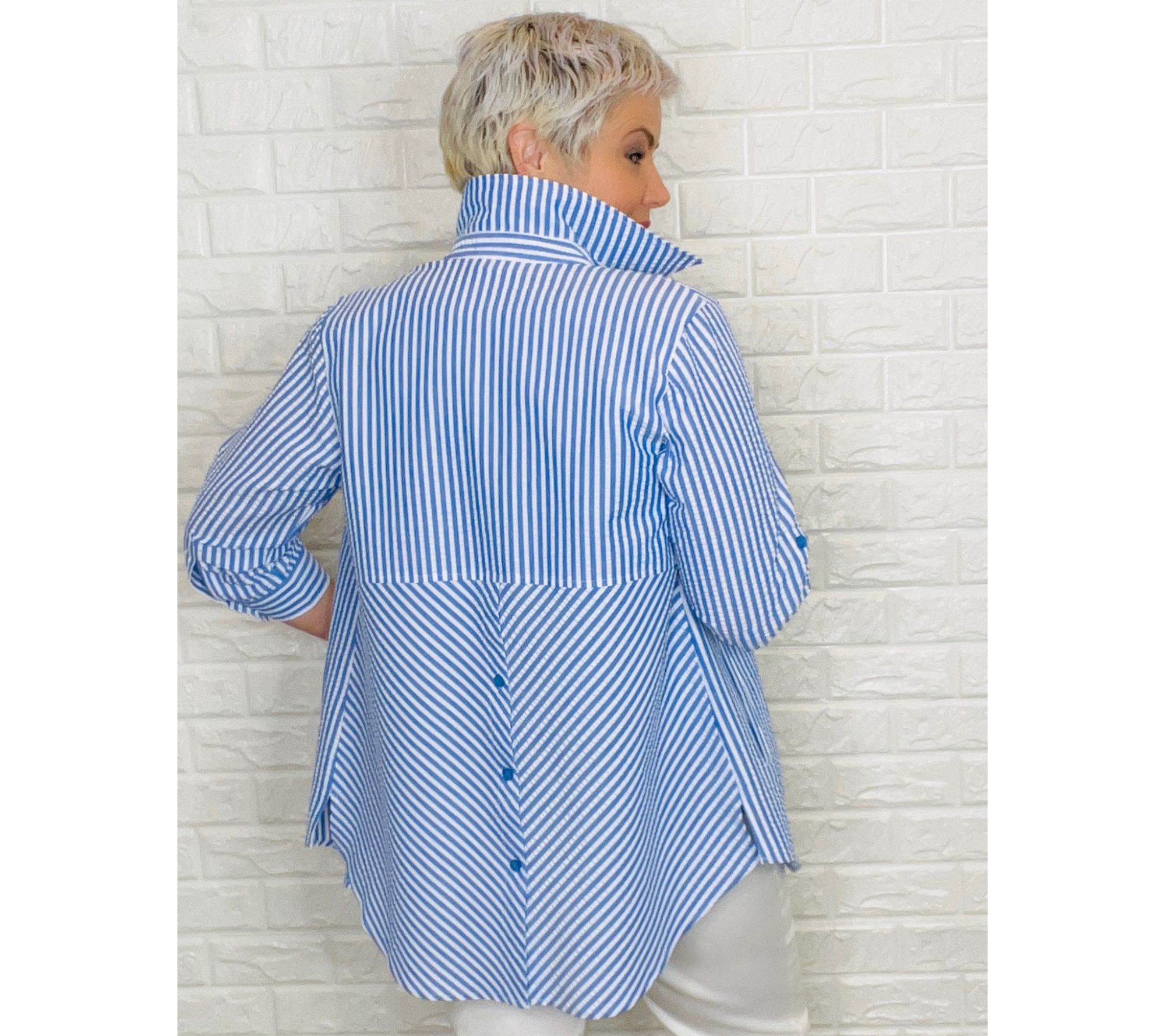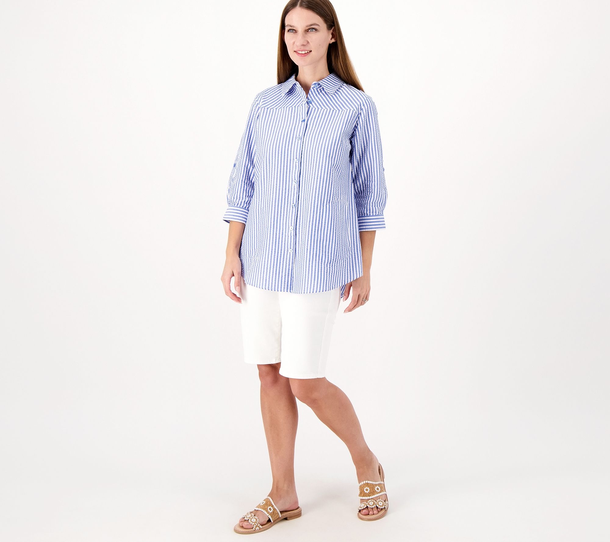 A classic style with a subtle twist, this seersucker shirt features a fab surprise when you turn around -- a back button detail that's an easy-breezy addition to this dressier-than-it-feels option. From the Joan Rivers Classics Collection®.