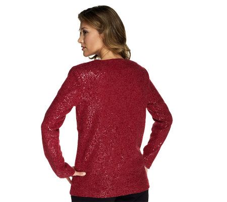 It's easy to take a shine to this pretty cardigan. The feminine flair of the slight swing shape is complemented by a flattering jewel neckline and long sleeves. For a special touch, allover sequins add delightful sparkle. From the Joan Rivers Classics Collection(TM).