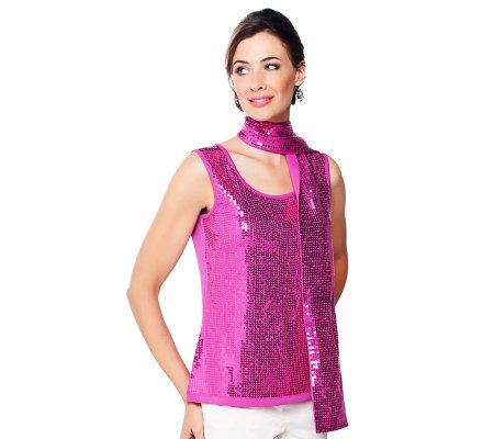 Glam up! Pull your look together with this smashing sequined set. The sparkling tank and matching scarf look beautiful bare, or beneath an evening blazer or shrug. From the Joan Rivers Classics Collection(R).