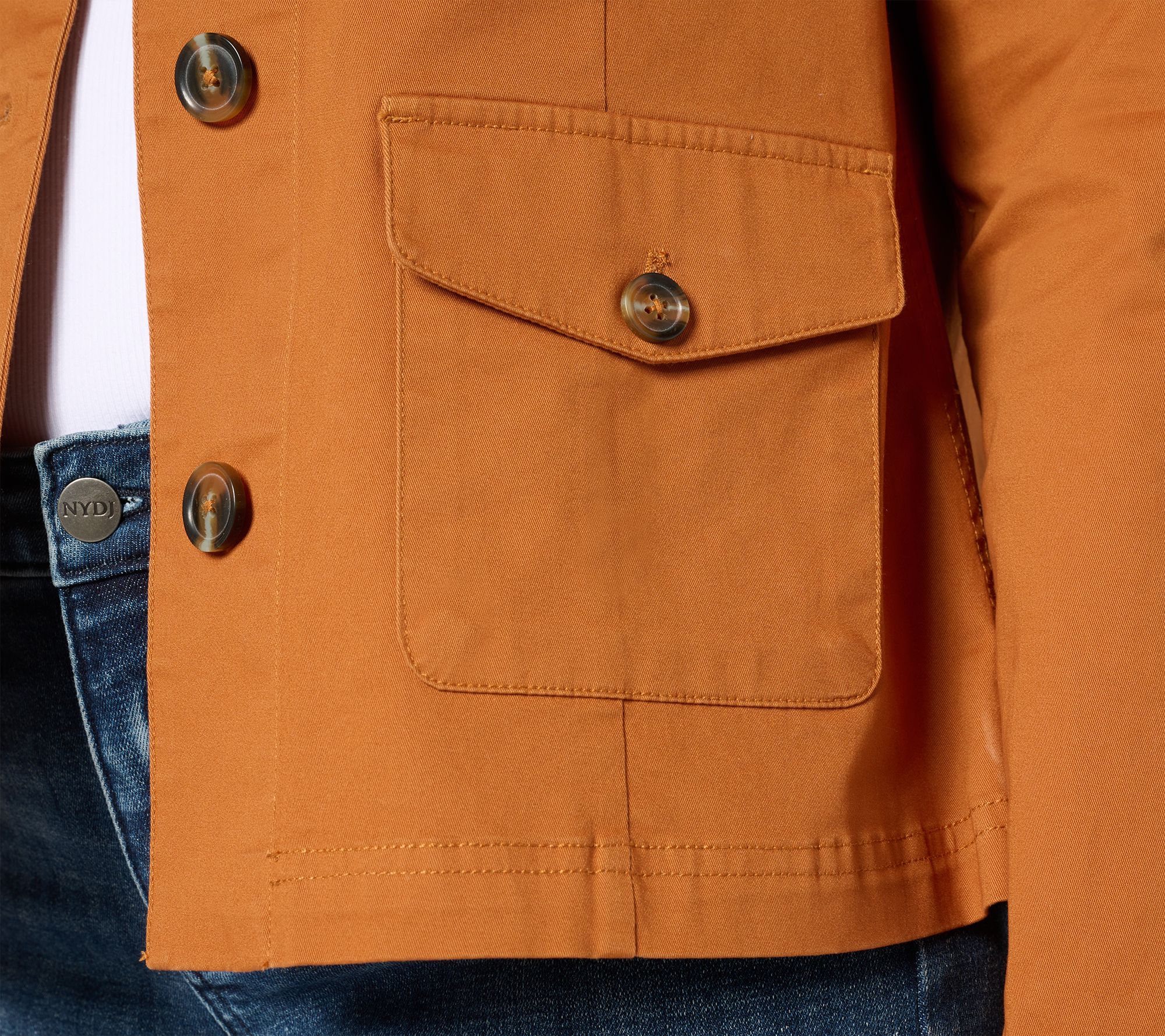 Features: four pockets, button-front closure, bust darts, seaming details
