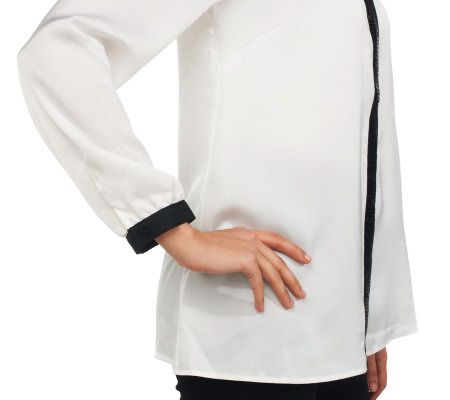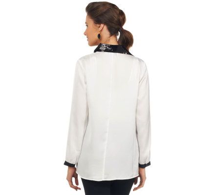 Smart, sophisticated, and dripping with sumptuous style, this gorgeous shirt is fashioned with inset sleeves with black trim, a notched collar, and an embellished front. From the Joan Rivers Classics Collection(R).