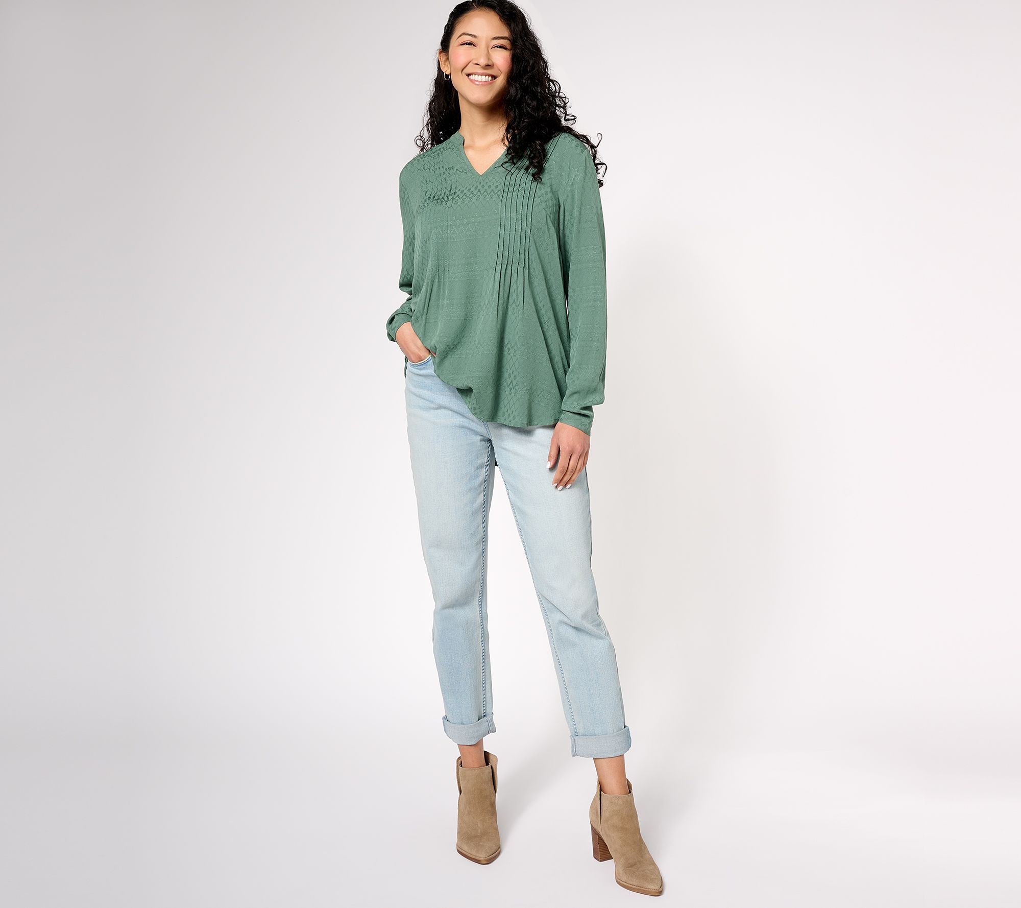 A textured top with a touch of boho beauty, this pull-over is effortlessly flattering (and easy to pair!) with its flowing design and smocked details. It's sure to become a fast favorite. From the Joan Rivers Classics Collection®.