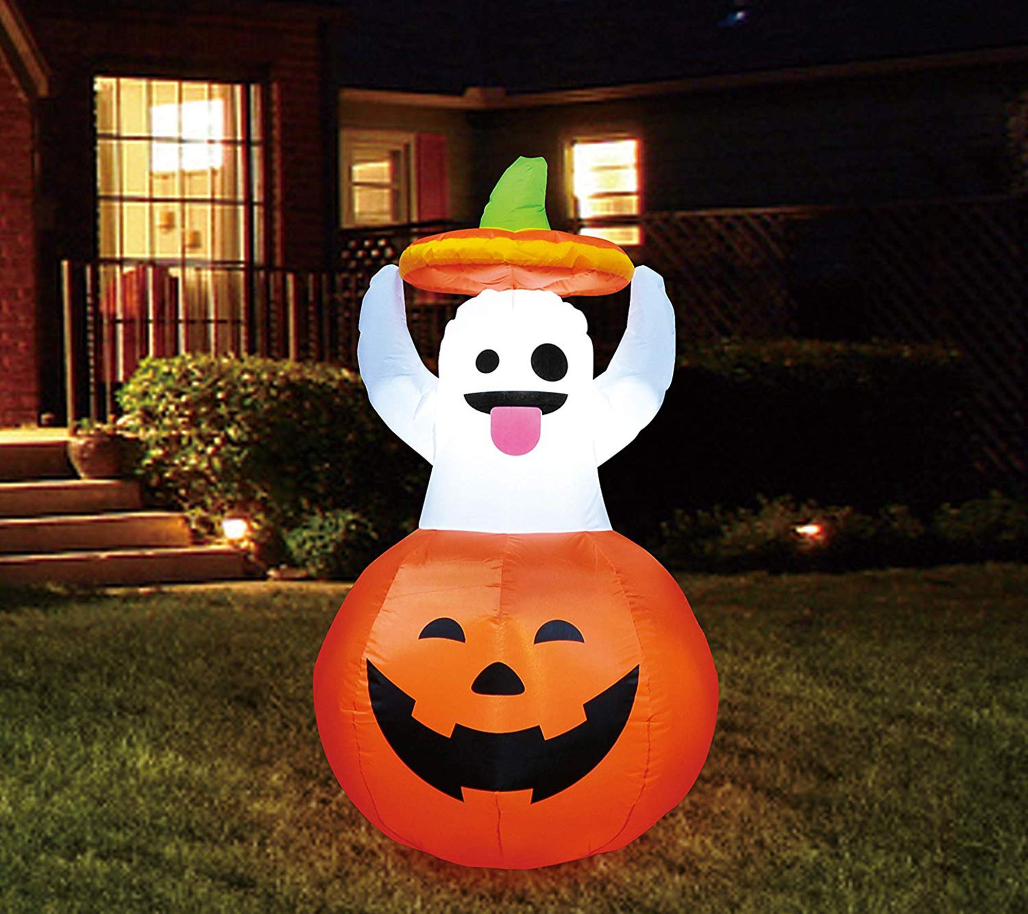 Welcome guests and trick-or-treaters to your home with this ghost in pumpkin inflatable. Pre-lit with three LED lights, it illuminates a charming glow and even makes a great display for festive Halloween photos. From Joiedomi.