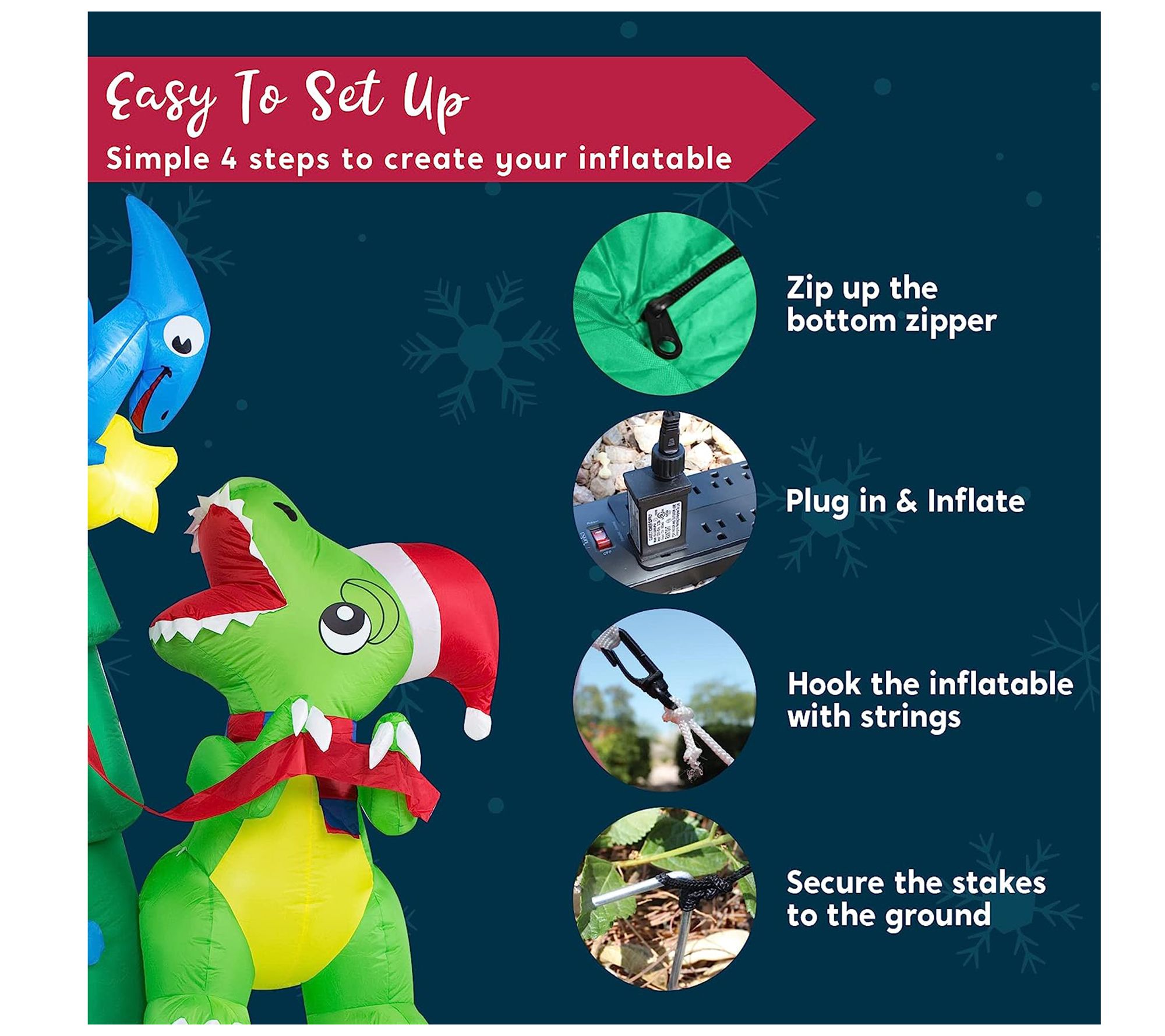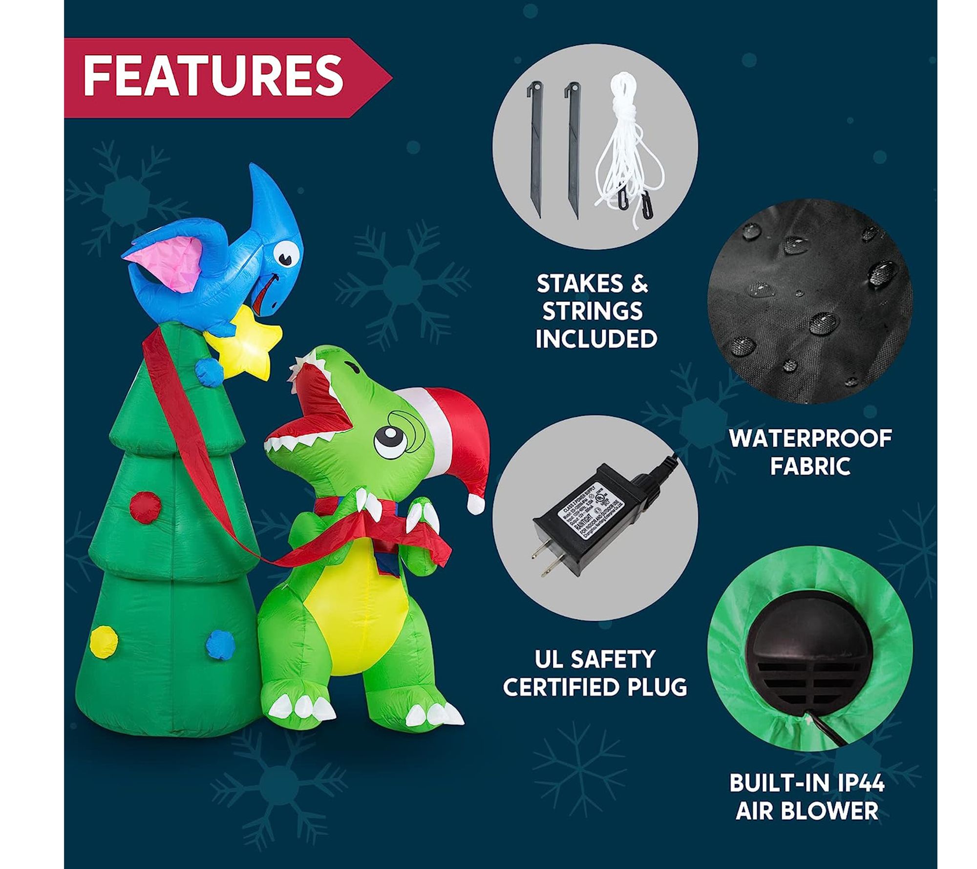 • Includes inflatable decoration, extended cords, fastened ropes, built-in sandbags, and plug