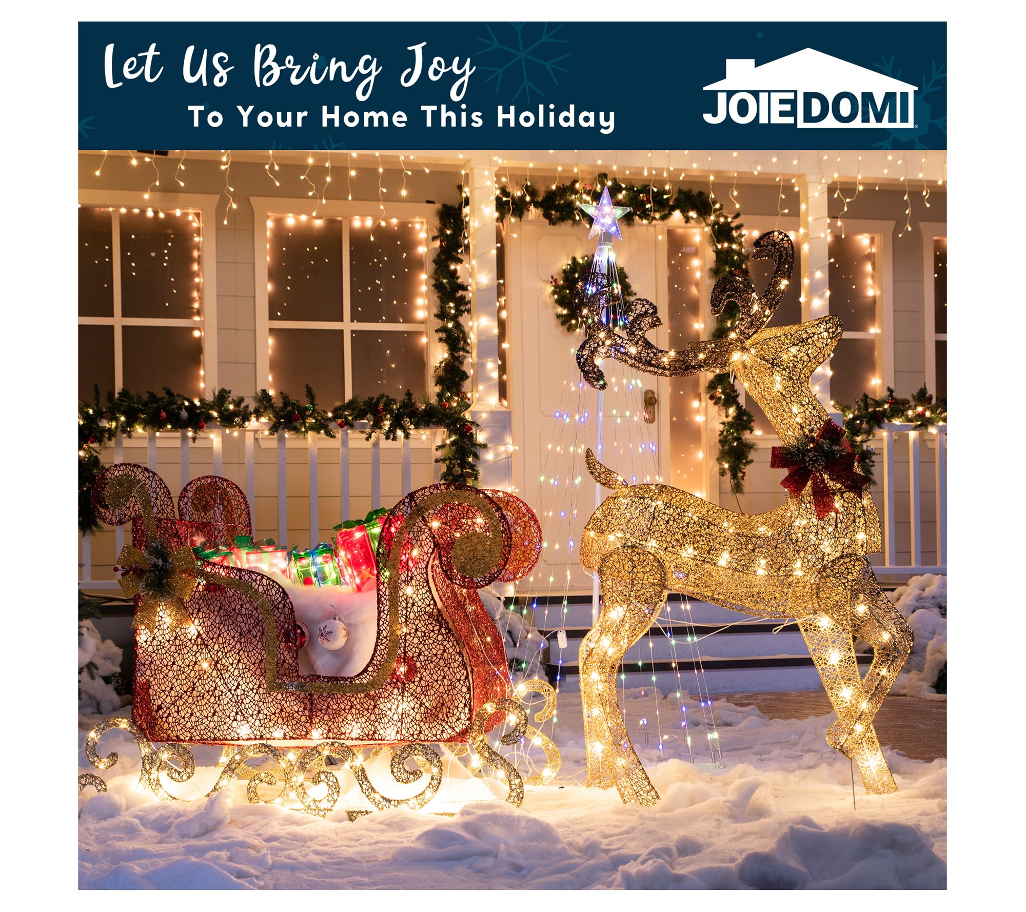 Dressed in a festive bow and prancing through the yard pulling a shimmering red sleigh, this beautiful reindeer is ready to deliver a load of woodland charm to your holiday display. From Joiedomi.