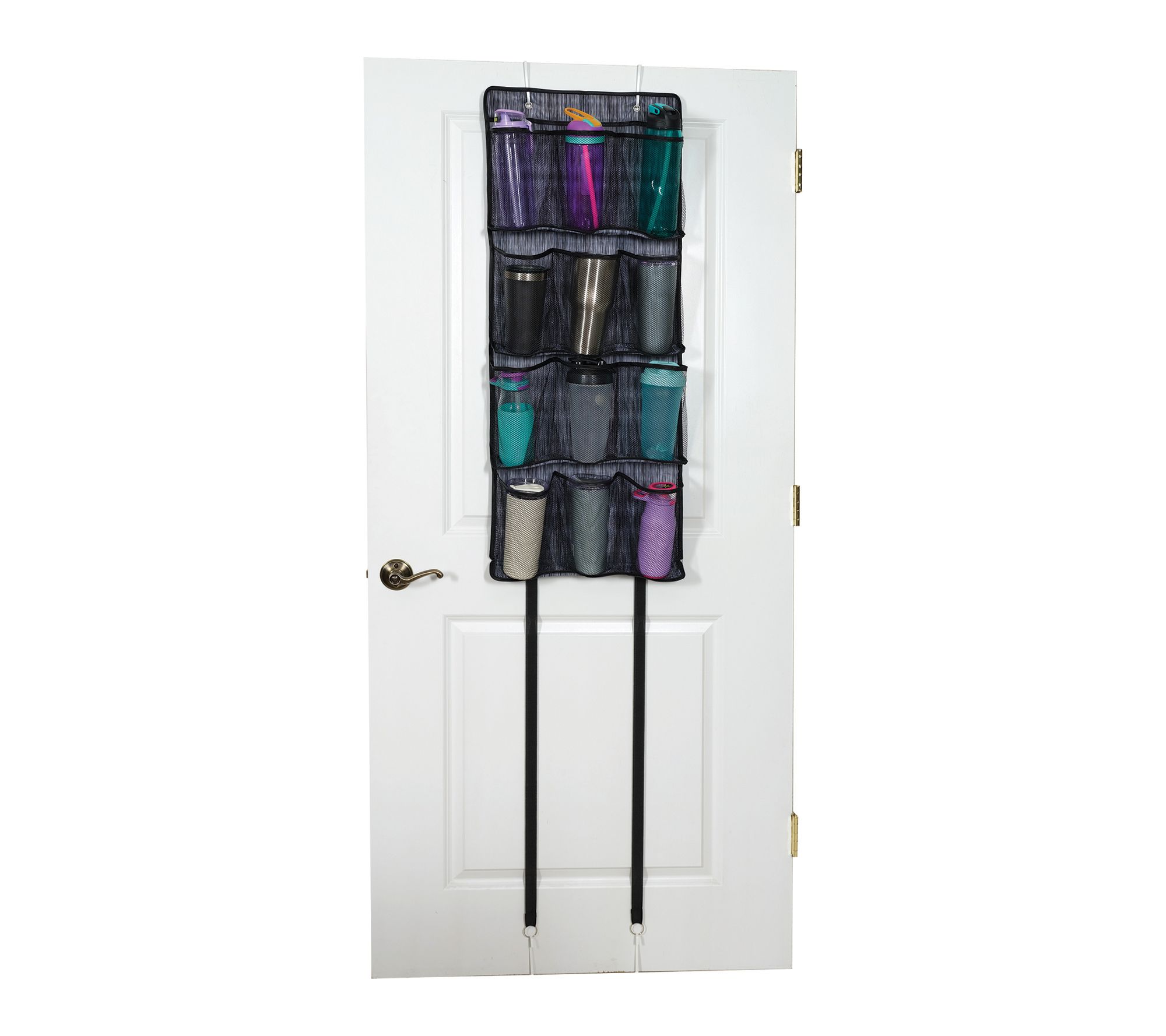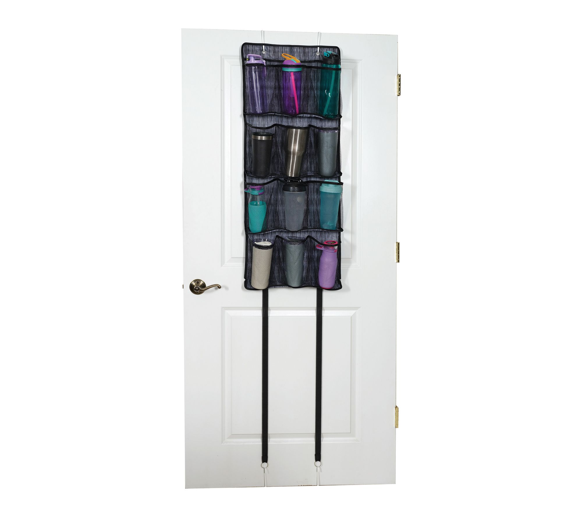 • 24 pockets organize water bottles and tumblers along with lids
