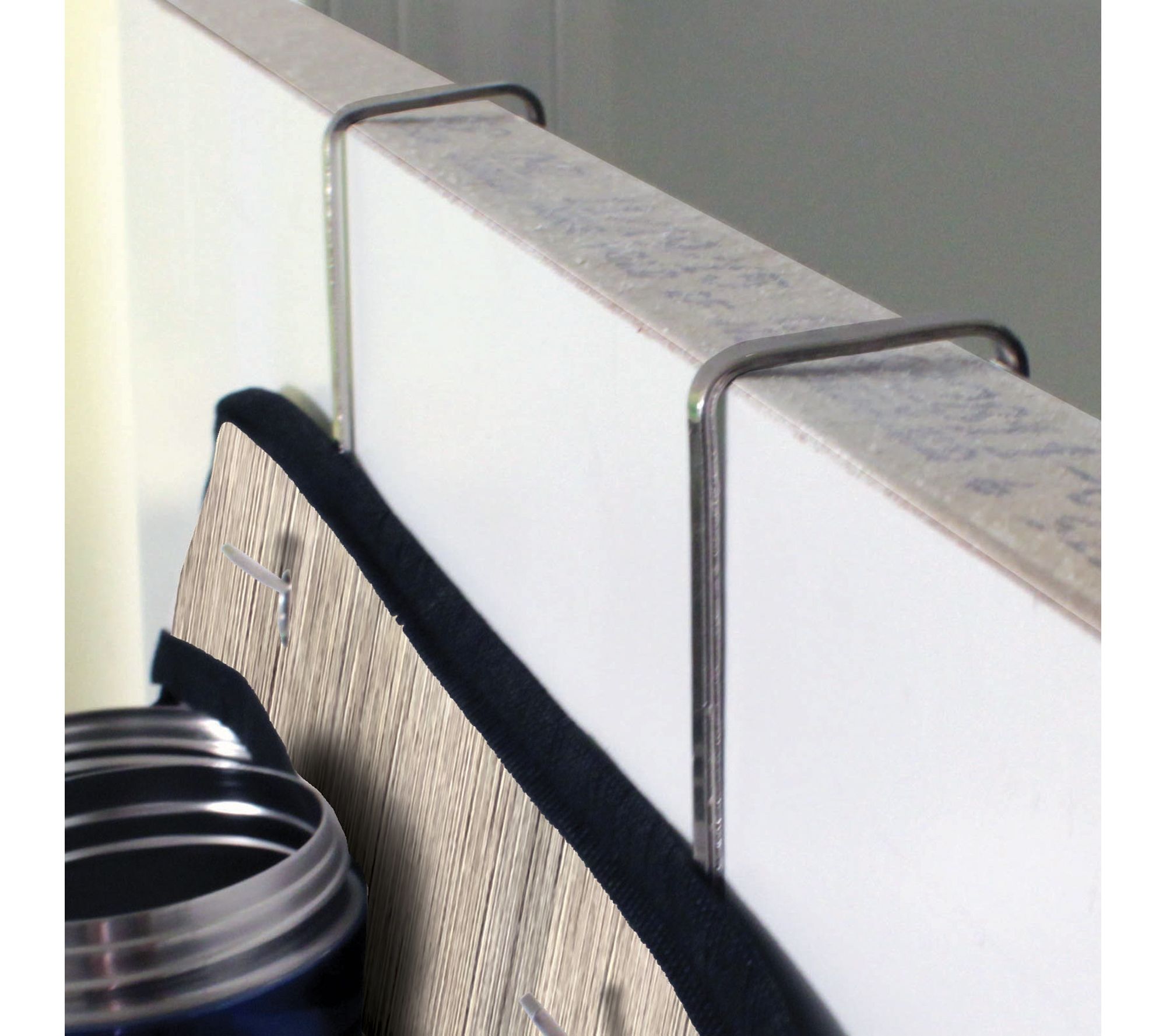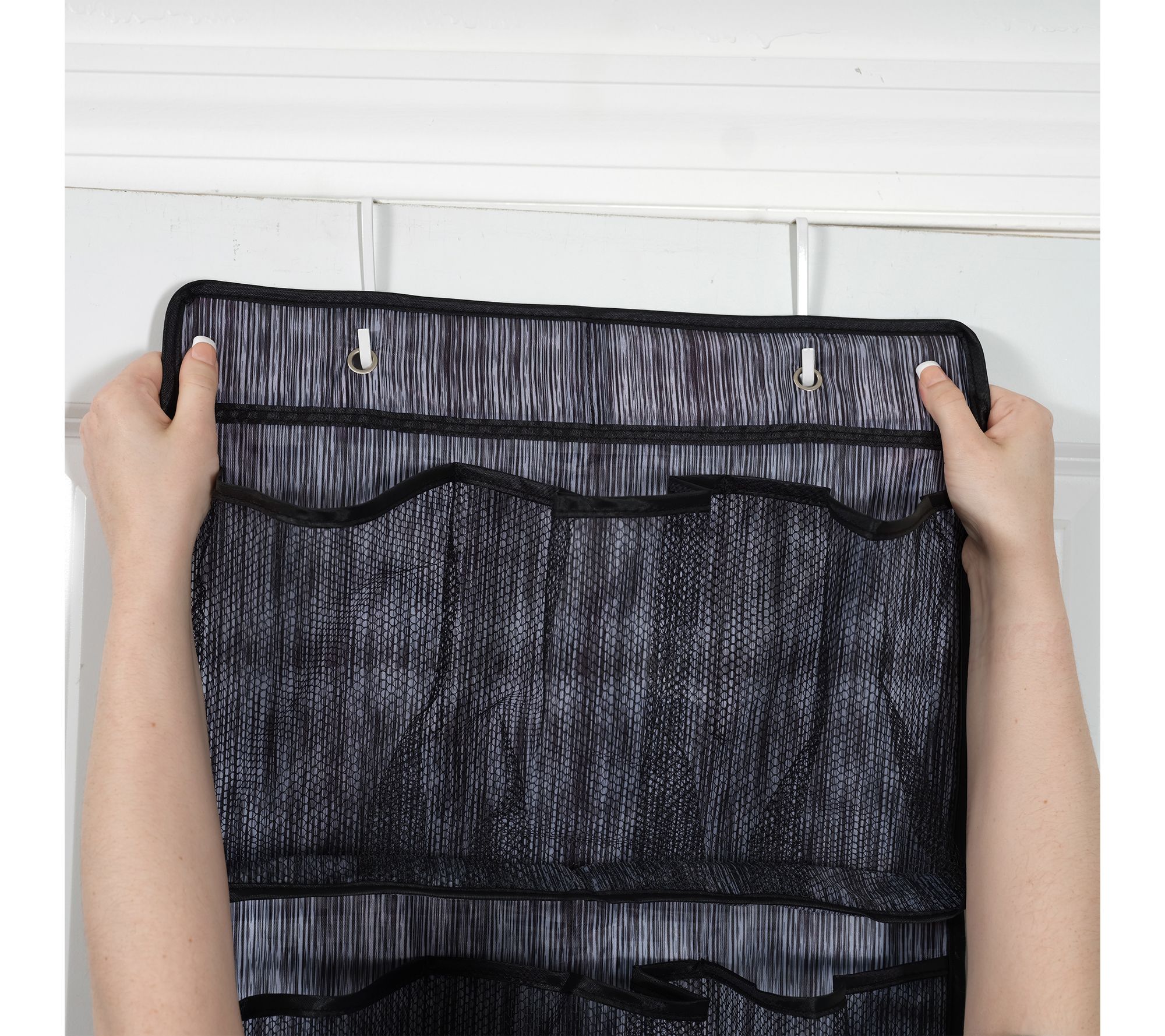 • Hangs over the door; attaches under the door for stability