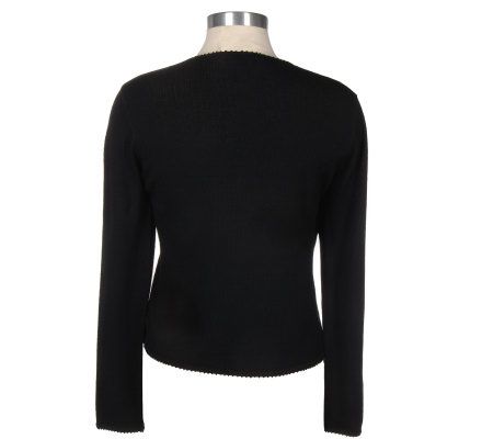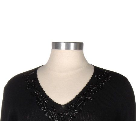 A top that touts your impeccable fashion sense, this Jones Elements pullover makes a stylish impression wherever you wear it. It is equally well-appointed when worn with a skirt, jeans, or slacks. Bugle beading adds sparkle to the neckline, sleeves, and hem, while flower beading details the neckline. Long sleeves.