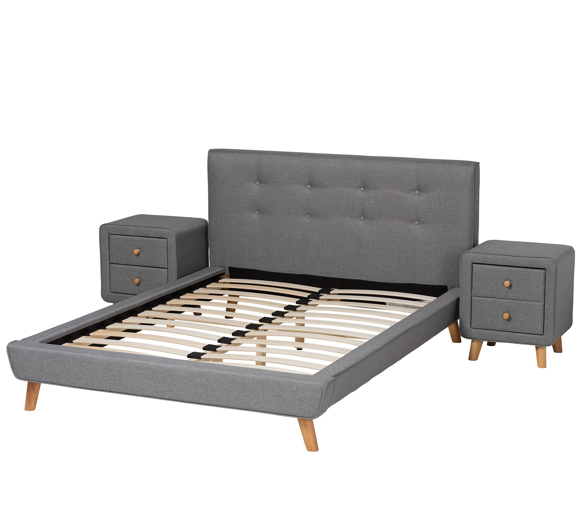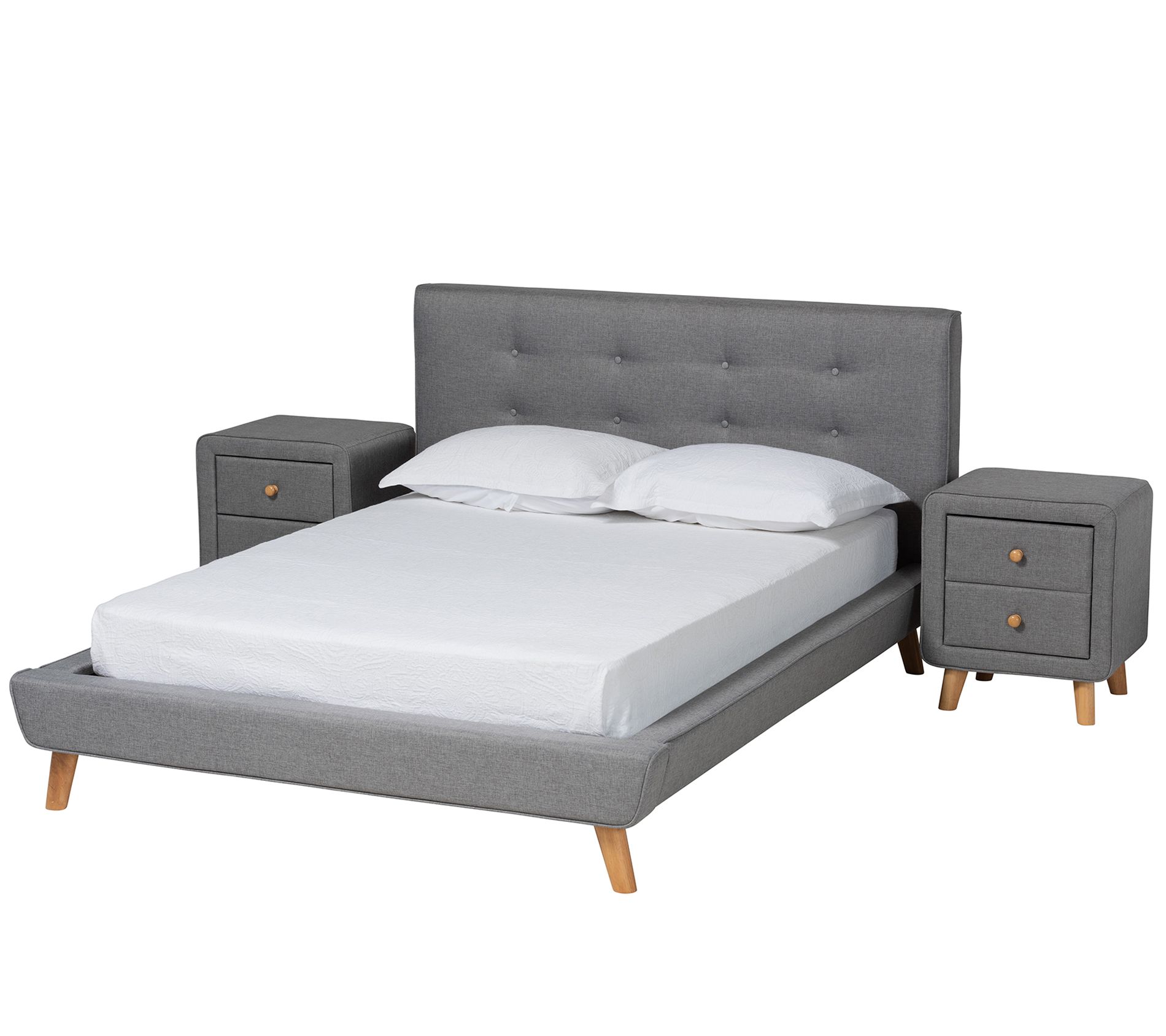 Fabric upholstery and tufted detailing give this Jonesy bedroom set rich texture and dimension while the tapered legs deliver a mid-century vibe. From Baxton Studio.