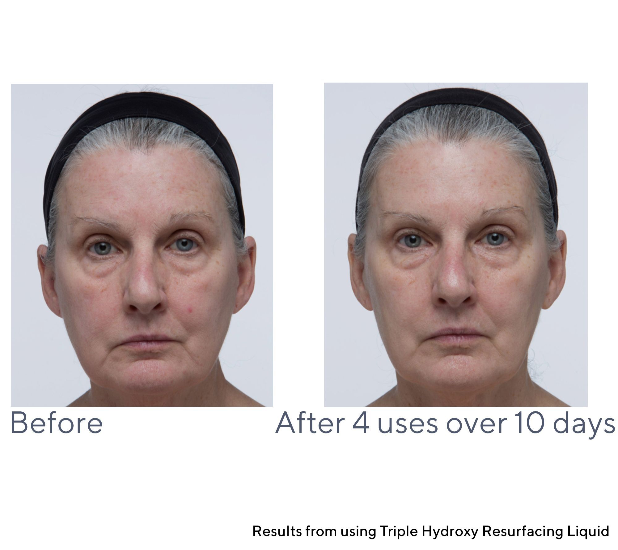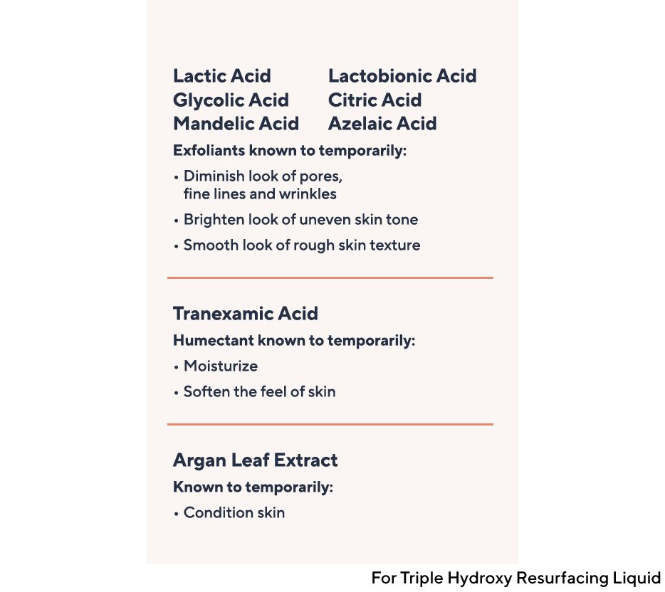 Brighten and smooth with Triple Hydroxy Resurfacing Liquid. A combination of six different skin-exfoliating acids is paired with Argan leaf extract to refine the look of pores and rough texture, smooth the appearance of wrinkles, and brighten overall skin tone in one step.