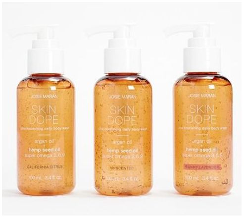 Enjoy the refreshing bliss of Josie Maran Skin Dope Ultra-Nourishing Daily Body Wash in three refreshing scents in this travel-sized set. Sulfate-free and made with hemp seed oil, this three-piece set provides skin with moisture while gently cleansing, so you don't strip skin of it's natural oils.