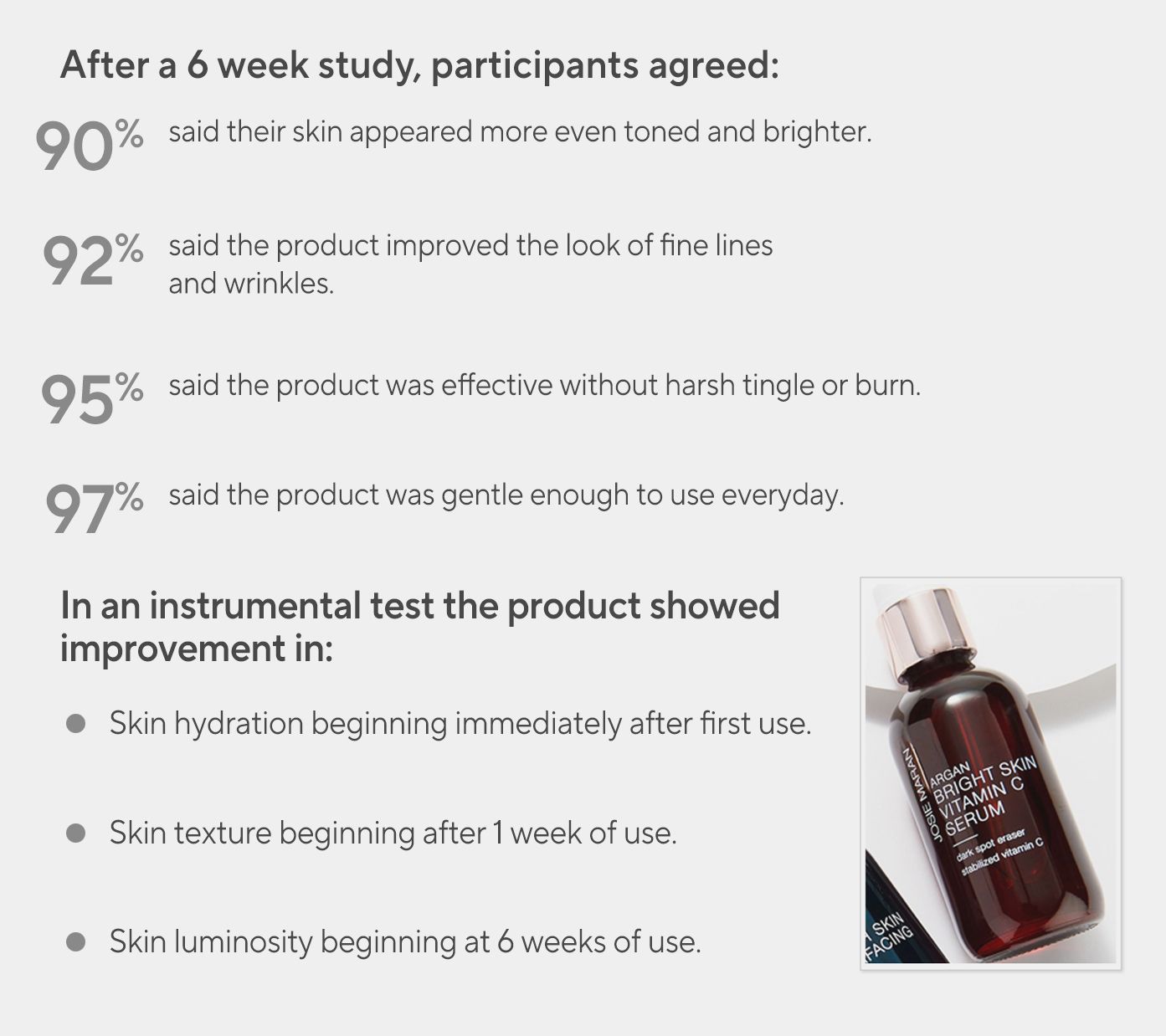How do I use it: In the morning, apply two to four drops of Argan Bright Skin Vitamin C Serum to cleansed skin. Follow with SPF and moisturizer.